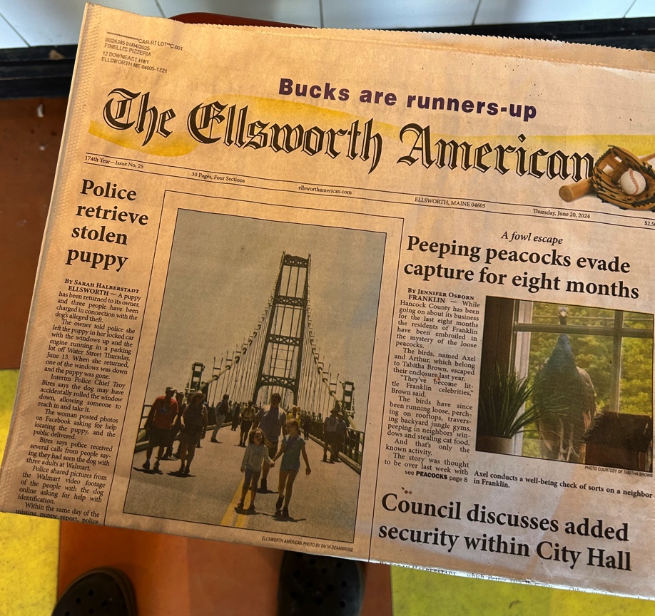 For starters, they say Maine has the lowest crime rate in the US. So what can the newspaper write about? There was a crime, and an escape: see the two top headlines.