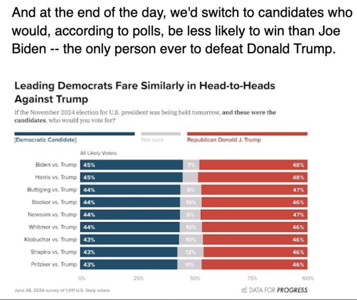 The Biden campaign sent a fundraising email that included a chart showing that Biden leads other Democrats in head-to-head matchups against Trump. (The extraordinary thing about this is not that it shows Biden outperforming various untested Democrats, but that Biden’s team decided to include it in a fundraising email at all.)