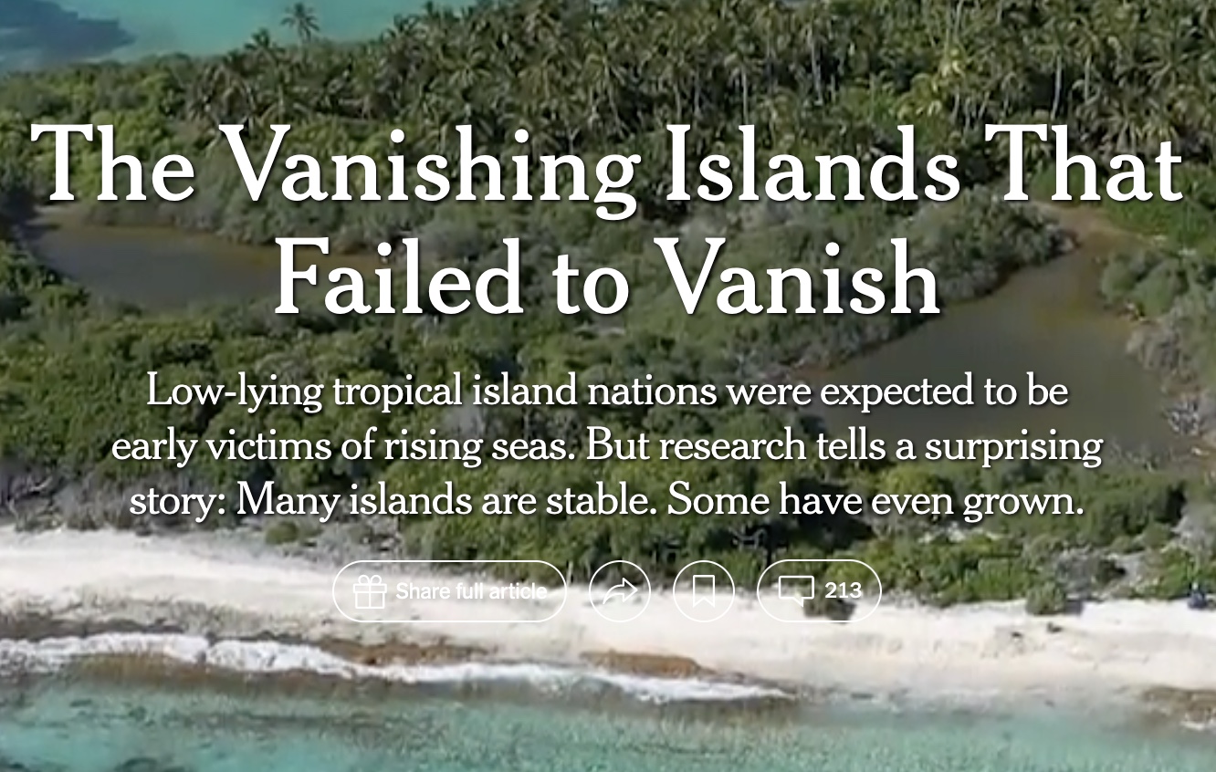 Shocker: NYT admits the seas only rise in some areas, and islands aren’t disappearing. And the “science” was looking at aerial photos over time. Duh.