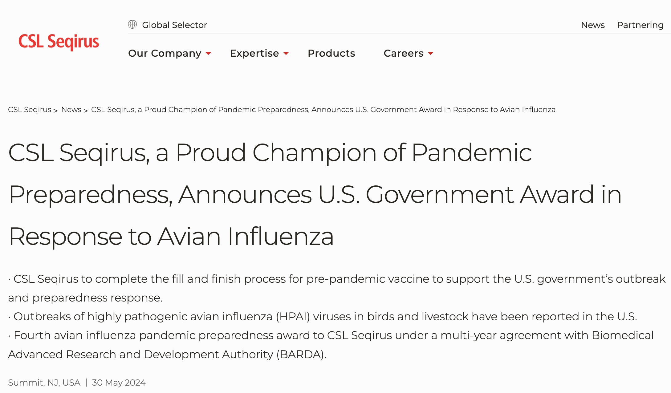 Avian influenza viruses are a significant public health risk due to their widespread circulation in animals and potential to cause a future pandemic. This development supplements ongoing work under the Pandemic Influenza Preparedness Framework to improve and strengthen the sharing of influenza viruses with human pandemic potential and increasing LMIC access to vaccines.