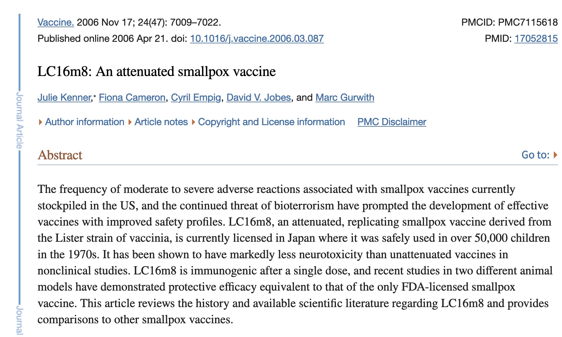 But in terms of monkeypox, the 2nd vaccine the WHO revealed today that it plans to use deserves a look. Below are selected passages from the 2006 article I linked to on how the LC16 vaccine was developed (from the same German grandparent vaccine as MVA-BN) in Japan to try and avoid the 20 cases of encephalopathy (most of whom were infants and died) per million doses of smallpox vaccine administered, that occurred in the 1960s and earlier.