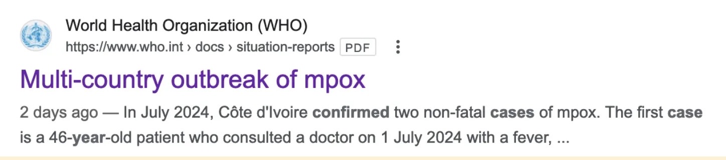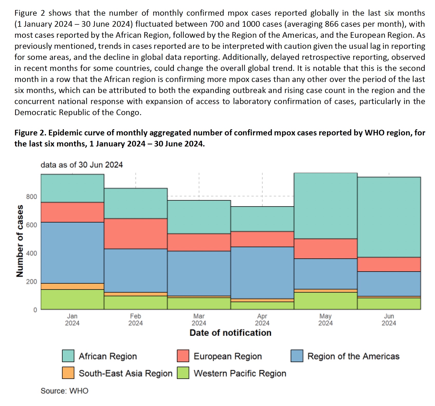 “This issue also features an update on the geographic expansion of mpox in the WHO African Region from July – August 2024, not yet captured in global surveillance data by 30 June 2024. Four new countries in Eastern Africa (Burundi, Kenya, Rwanda, and Uganda) reported their first mpox cases. All cases are linked to the expanding outbreak in East and Central Africa and all cases sequenced to date from these countries are clade I. Separately, Côte d’Ivoire is experiencing an outbreak of mpox linked to clade II MPXV and South Africa has reported two more confirmed cases.”