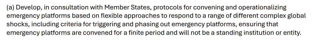 The Secretary-General is therefore asked to develop “protocols for convening and operationalising emergency platforms based on flexible approaches to respond to a range of different complex global shocks.”