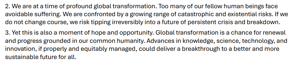 The pact’s message is that we are in a “global transformation” where a growing number of global catastrophic risks threaten to completely break the world apart (Breakdown).