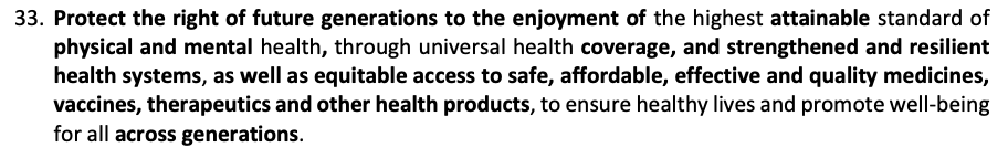According to the Declaration for Future Generations, “current generations must act with responsibility to safeguard the needs and interests of future generations”. These interests include “urgent climate action”, responding to demographic trends and strengthening health systems with “equitable” access to vaccines and other health products.