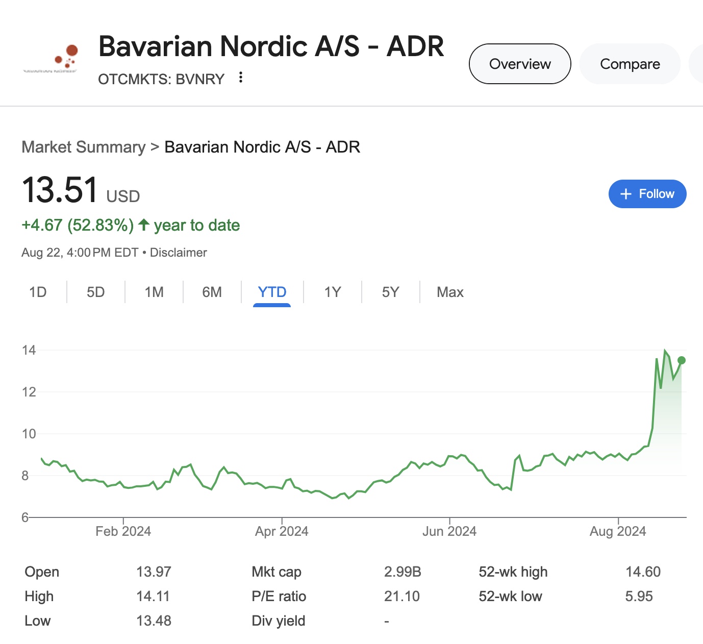 Here is Bavarian Nordic’s stock price year to date.