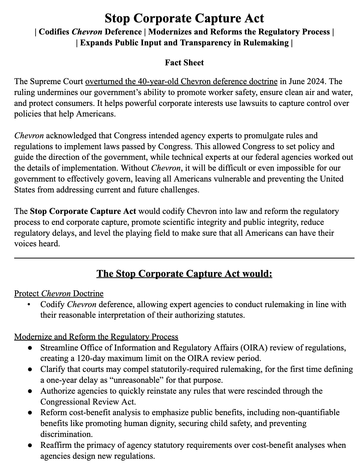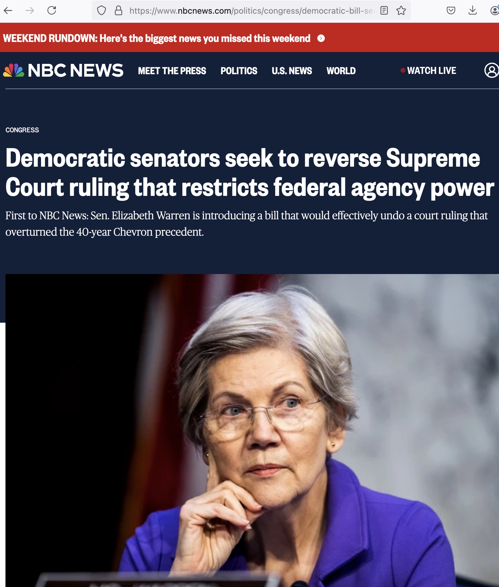 New legislation introduced today (which was July 24, 2024, not today) by Senator Elizabeth Warren (D-MA) would reverse the recent Supreme Court decision in Loper Bright and codify deference to federal agencies’ “reasonable” interpretation of statute as to whether regulation is congressionally authorized.