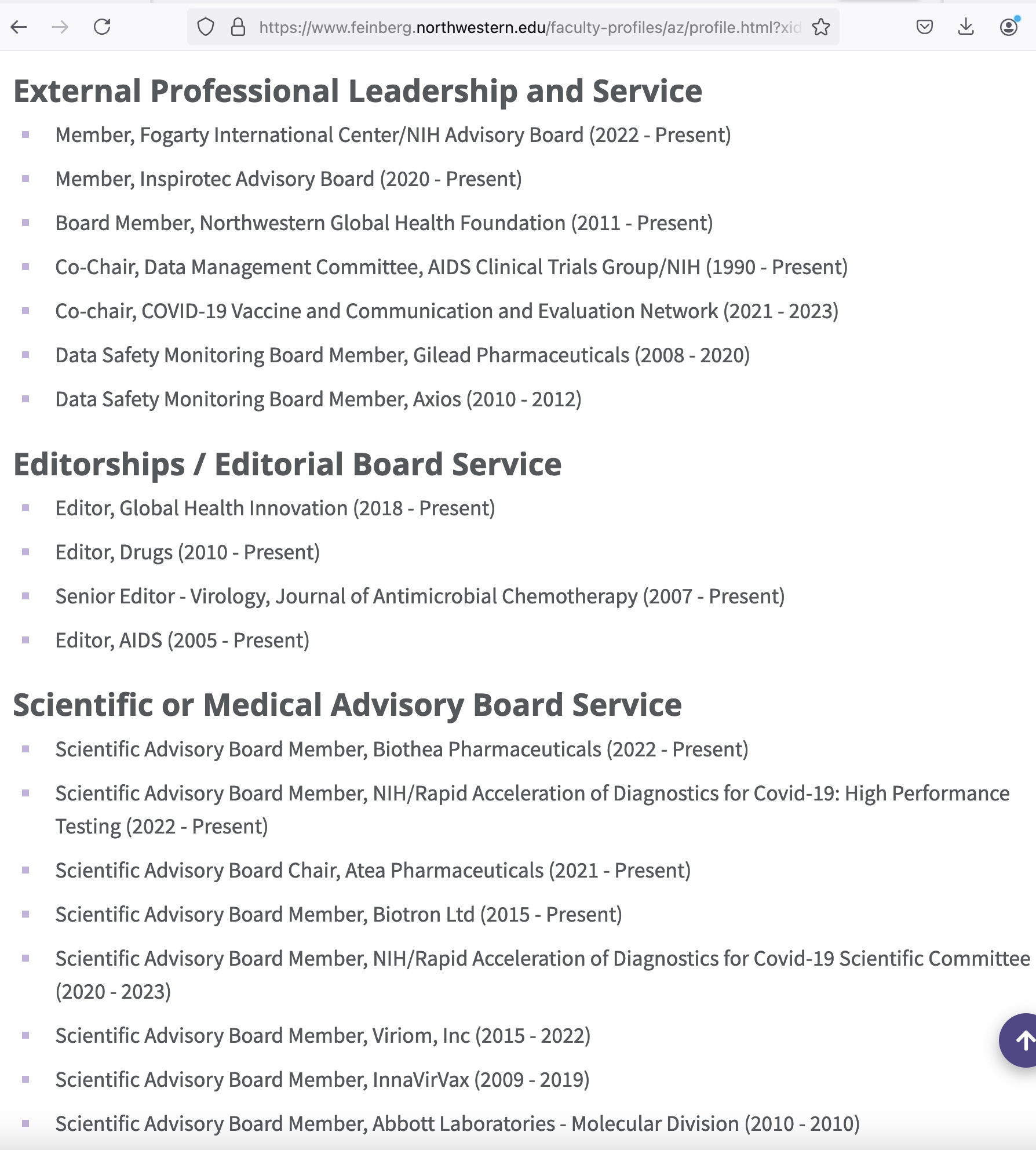 Here are relevant parts of his bio. Like Fauci, he has worked on HIV forever, but somehow never finds a cure. But makes a lot of money from industry and NIH trying.