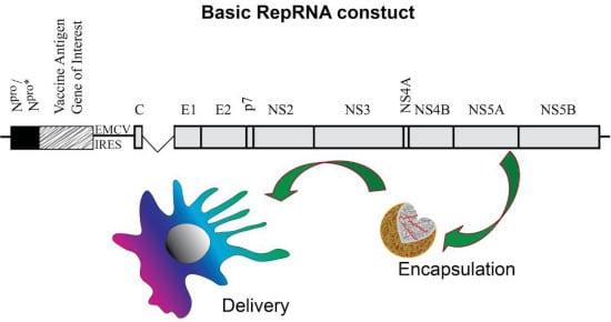 Whereas mRNA vaccines encode a protein of interest, replicons have been engineered as a molecular chassis encoding the gene of interest (GOI; transgene) and all essential elements allowing self-amplification of the replicon RNA. The rapid amplification of replicon RNA in target cells increases the expression of the protein of interest (e.g., a viral (glyco)protein) (Figure 1) and induces a protective immune response at a markedly lower initial RNA dose than conventional mRNA vaccines [2,3].