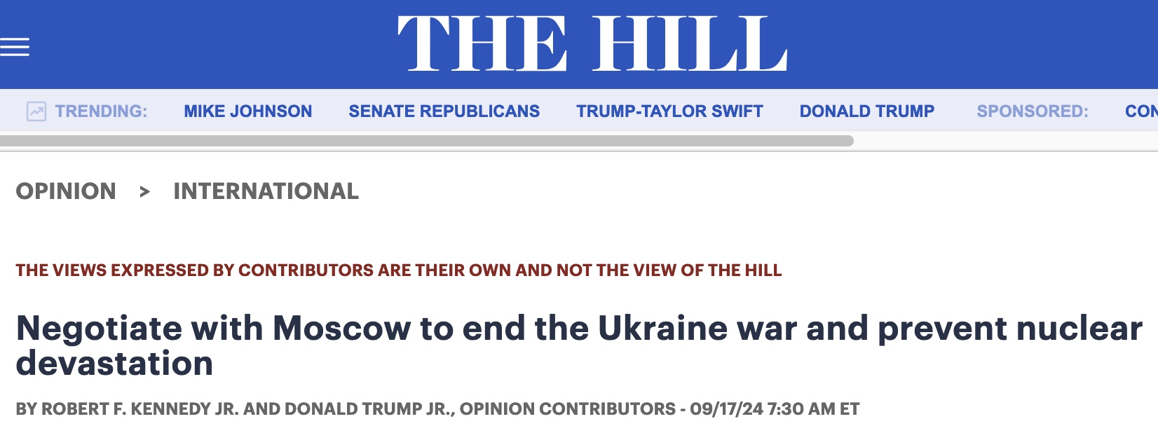 Negotiate with Moscow to end the Ukraine war and prevent nuclear devastation by Robert F. Kennedy Jr. and Donald Trump Jr./The Hill