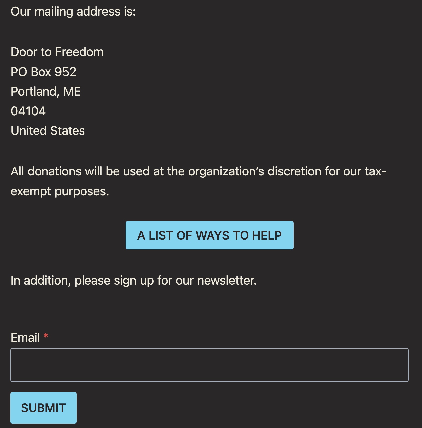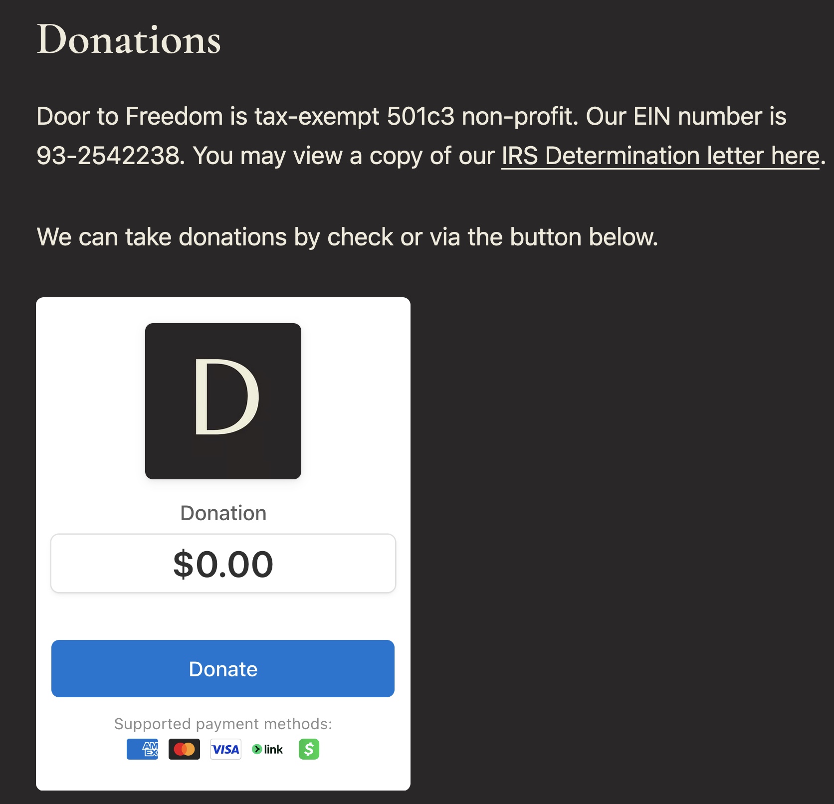 Door to Freedom makes it hard to find the donate button on our DoorToFreedom.org home page. You have to scroll to the very bottom of the page to find it. Here are screenshots of what our donations page looks like: (https://doortofreedom.org/donate/). If you click on these orange links you can go there and make a credit card or stripe donation, or better yet, send a check if you want to help us.
