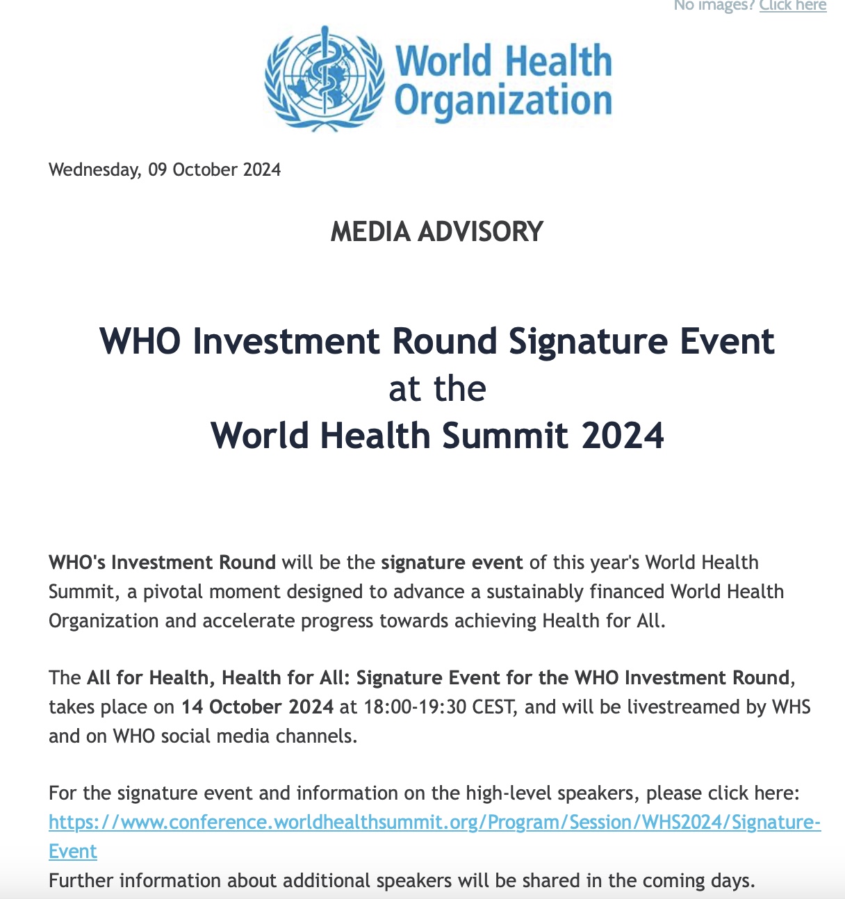 Next "investment round" i.e. call for donations starts next Monday, October 14 at the World Health Summit. A "pivotal moment," "signature event," and begging bowl wrapped into one