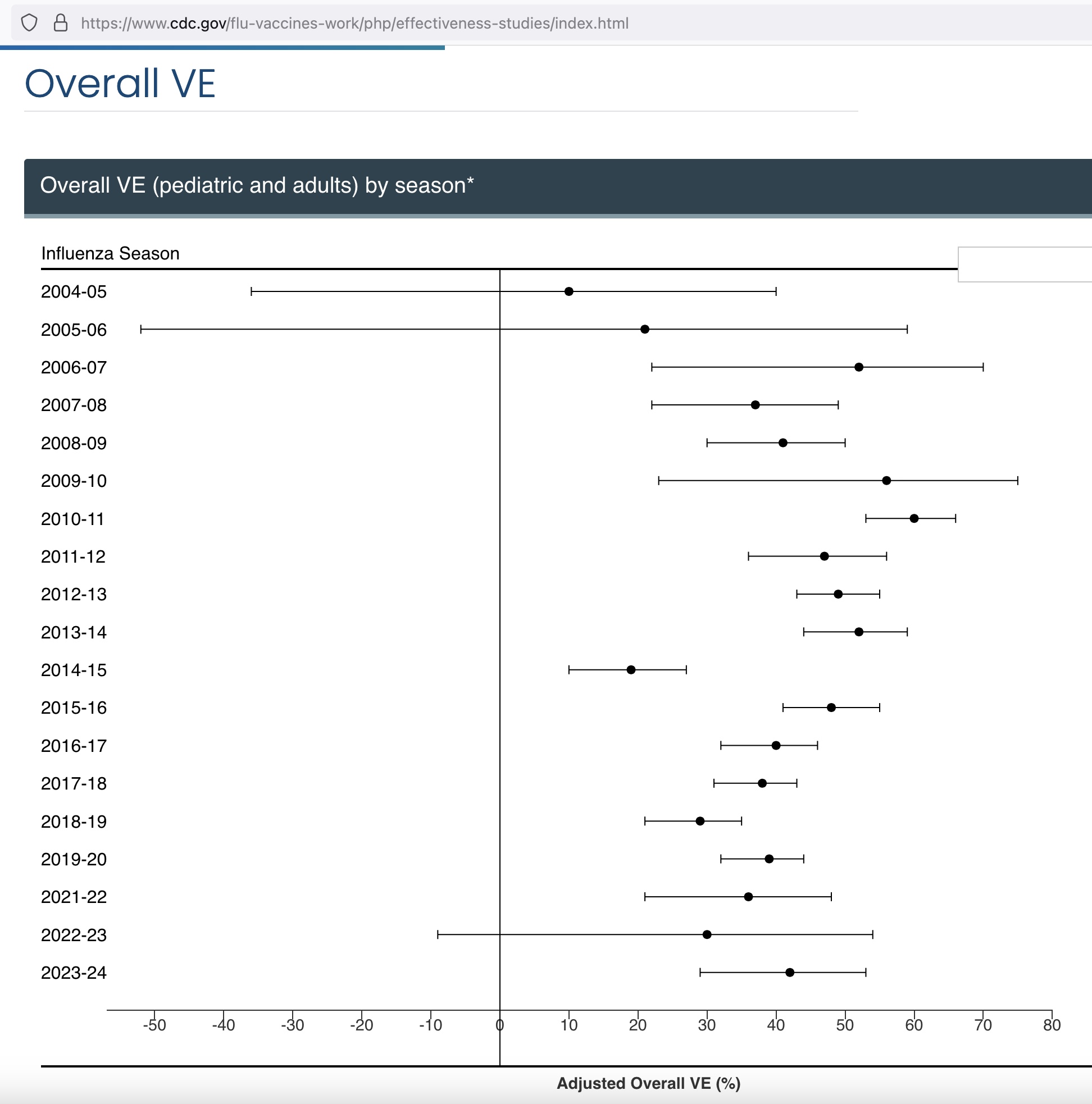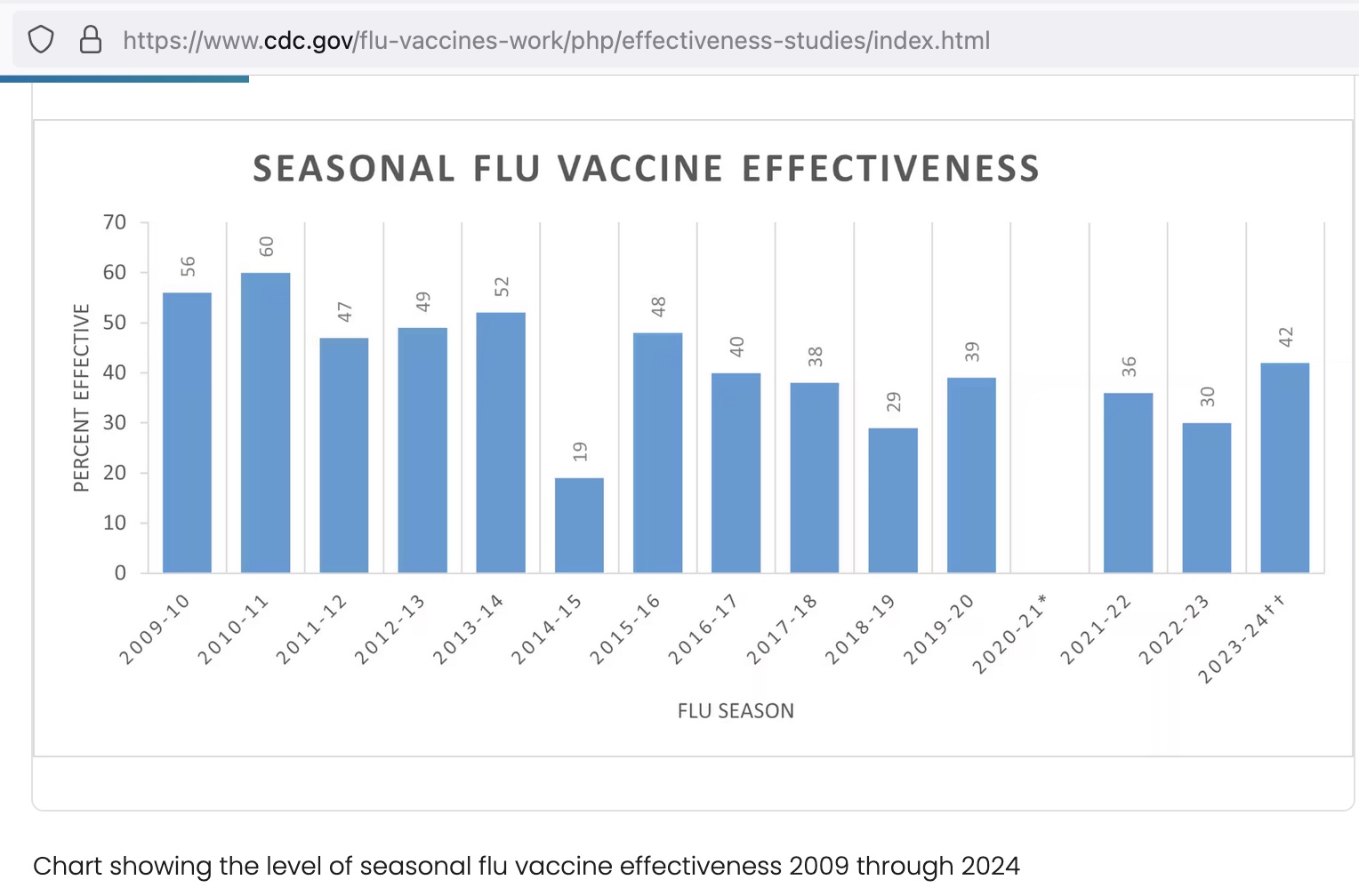 Update for 2024 below. I have posted these data before for previous years. Note that during the past TEN flu seasons, CDC only claims that seasonal flu shot efficacy was greater than 40% for 2 seasons. Despite FDA slowly converting the US seasonal flu shots from 3 antigens to 4, it has now reversed that plan and told manufacturers to go back to 3 antigens only (1 each Influenza A H1N1 and 1 H3N2, 1 Influenza B antigen).