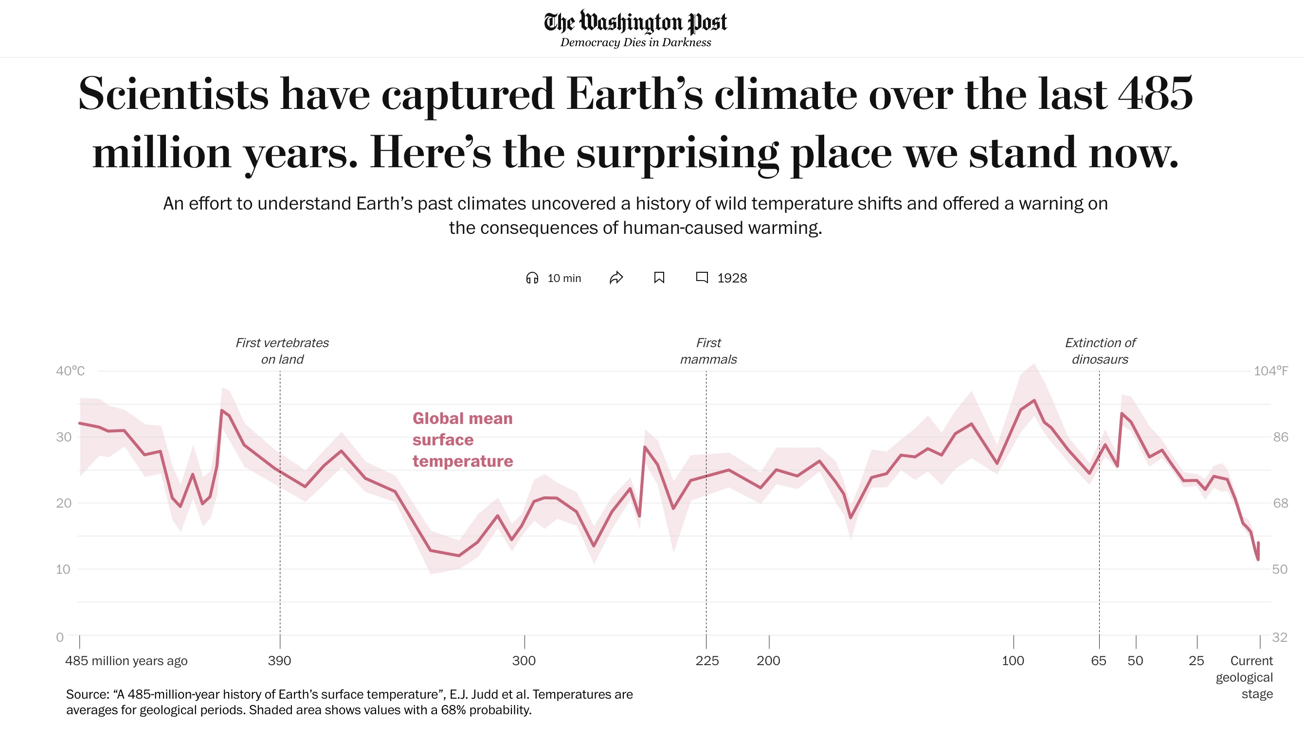 They did a great job burying this HUGE story. Turns out we are in a several million year cold spell and nothing bad will happen if we get a bit warmer. Go to the WaPo article to see all the graphics