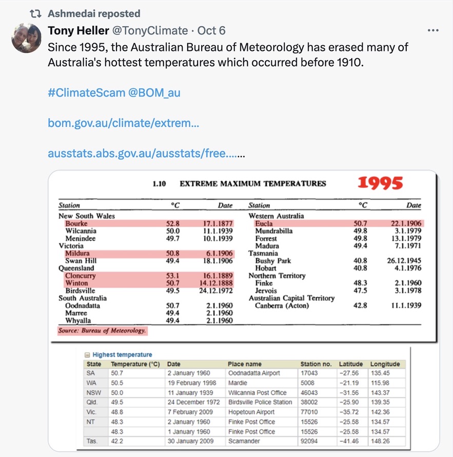 And for the billions of people who are now living through the hottest years ever recorded [Because someone deleted old data from when it was warmer; see the Australian data below—Nass]— and facing a hotter future still — Judd said the timeline should serve as a wake-up call. Even under the worst-case scenarios, human-caused warming will not push the Earth beyond the bounds of habitability. But it will create conditions unlike anything seen in the 300,000 years our species has existed — conditions that could wreak havoc through ecosystems and communities.