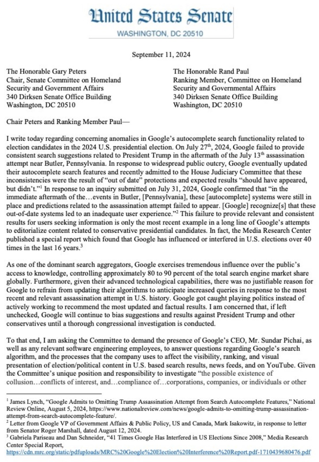 4. Google algorithms have admittedly helped or hurt candidates seeking high office. Senator Roger Marshall is asking for Google’s CEO to testify to Congress about this.