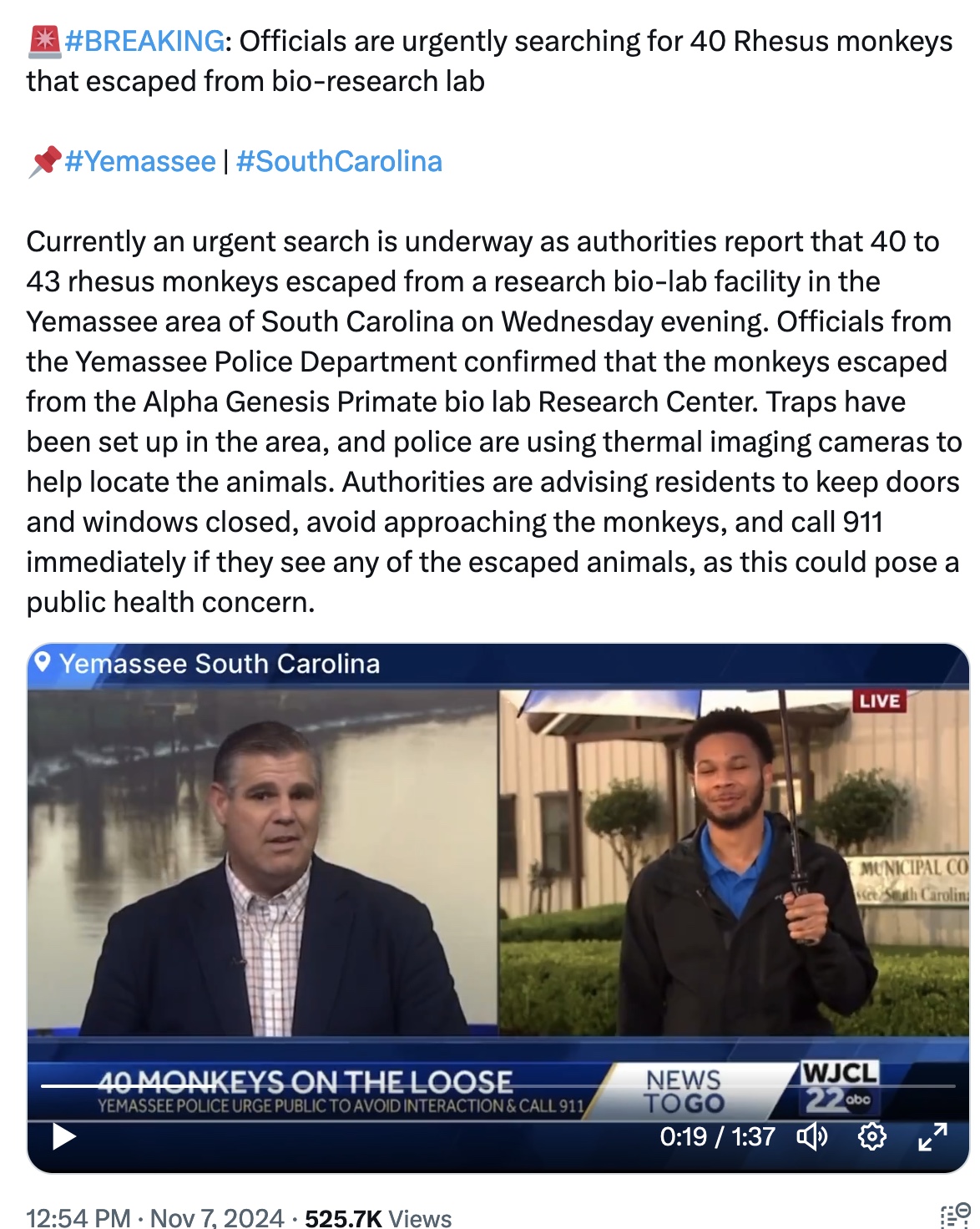 Primates on the Run. 40 rhesus monkeys escaped last night from Alpha Genesis facility in South Carolina. In 2016 there was an escape of 19 monkeys from the same place.