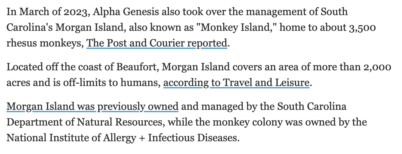 From USA Today, we learn that Alpha Genesis manages a nearby 2,000 acre island of monkeys, which it took over from the NIAID after Fauci retired. Guess NIAID did not want any more beagle/monkey stories circulating.