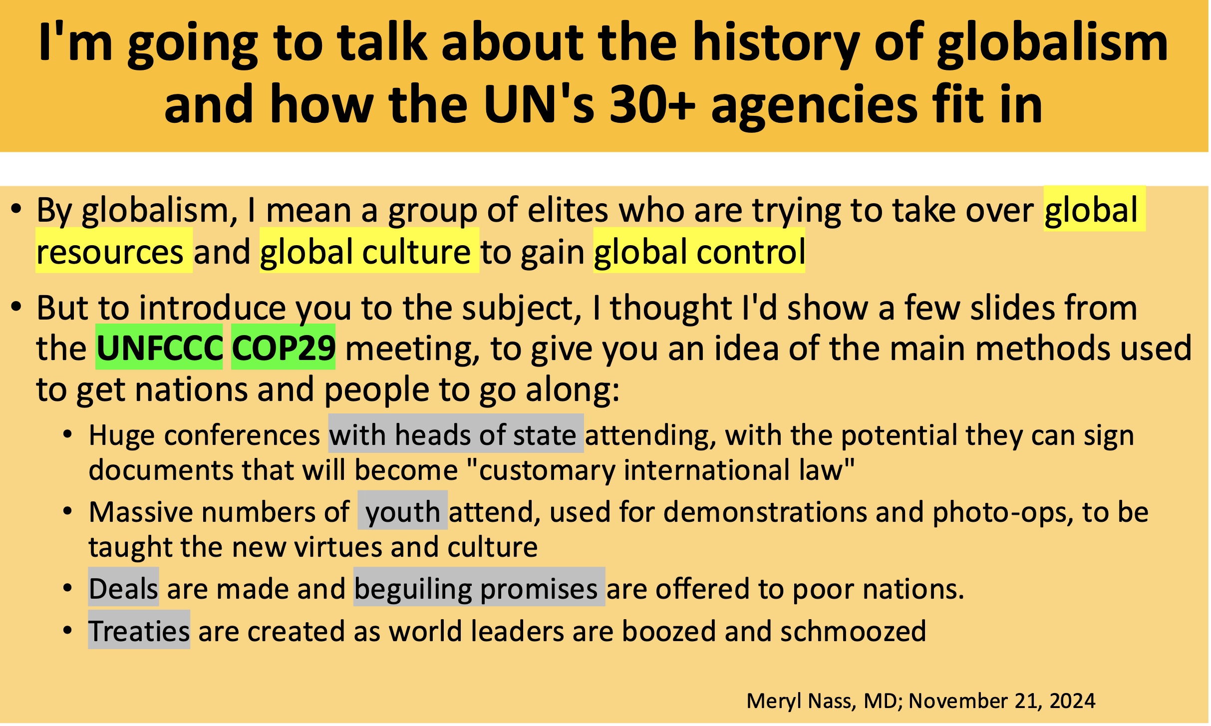 I’ve recently been writing and speaking about how UN conferences, agreements and formal treaties have been used to centralize control of the planet, its resources and people. Here is the start of the talk I gave last week, which is relevant to the meeting that starts tomorrow.