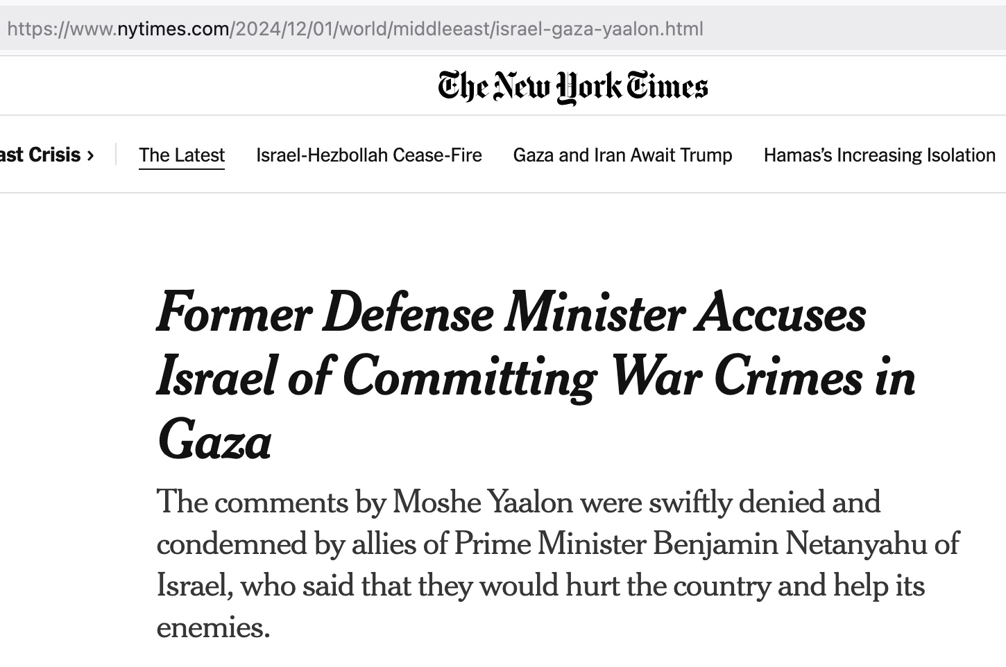 “I’m speaking in the name of IDF commanders who are operating in the northern strip,” Mr. Yaalon told the Reshet Bet radio station. “They reached out to me expressing fear about what’s happening there.” [In other words, the brass are being told to commit war crimes, and they know what they are doing—Nass]