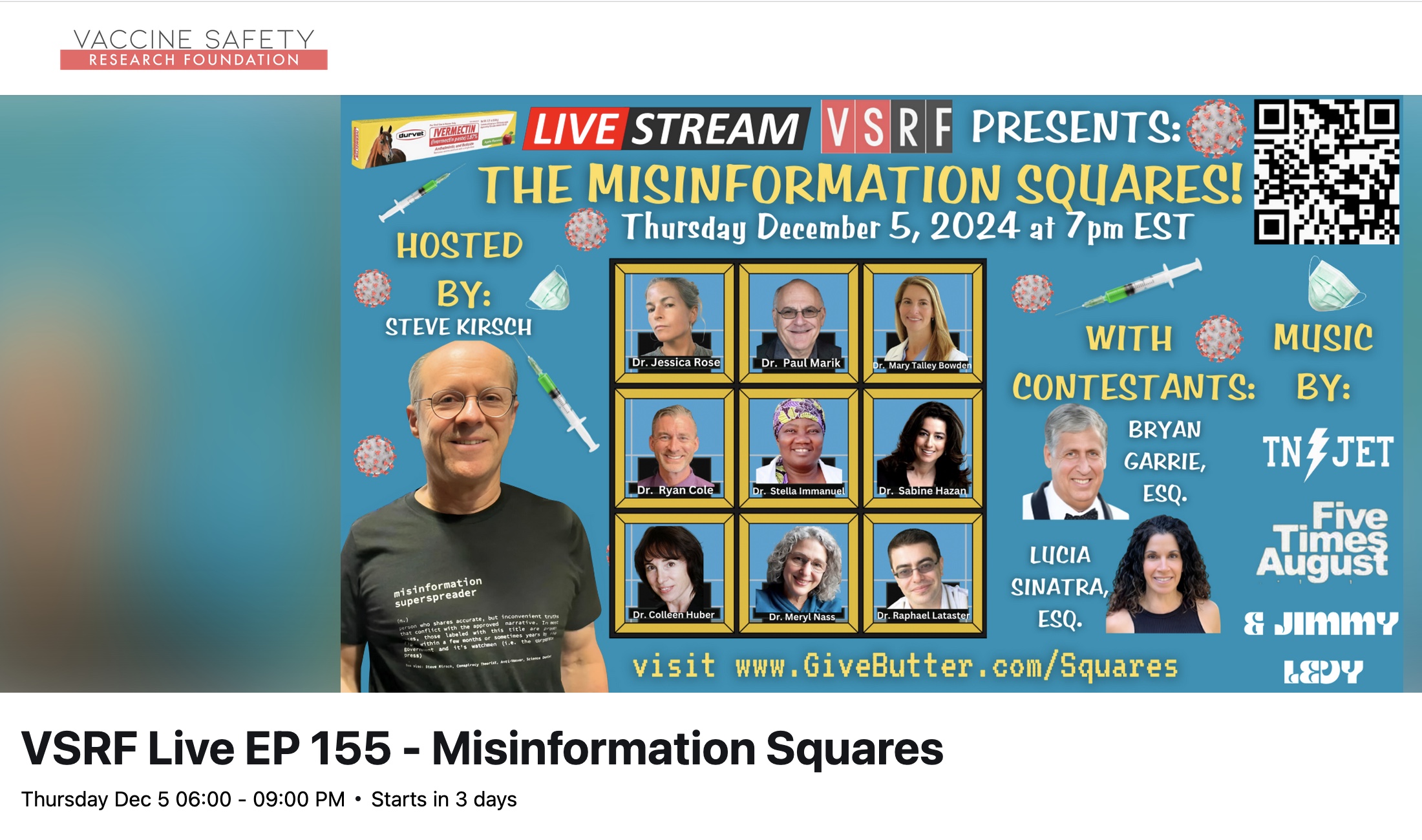 This Thursday, December 5th at 7pm EST we will be hosting our end of the year Fundraiser titled, “Misinformation Squares” based upon the once-popular Hollywood Squares gameshow. The game squares will be filled with our favorite vaccine-aware doctors who we all know and love, with two knowledgeable lawyers as contestants! We will even have fantastic live music courtesy of Tennessee Jet, Jimmy Levy and Five Times August.