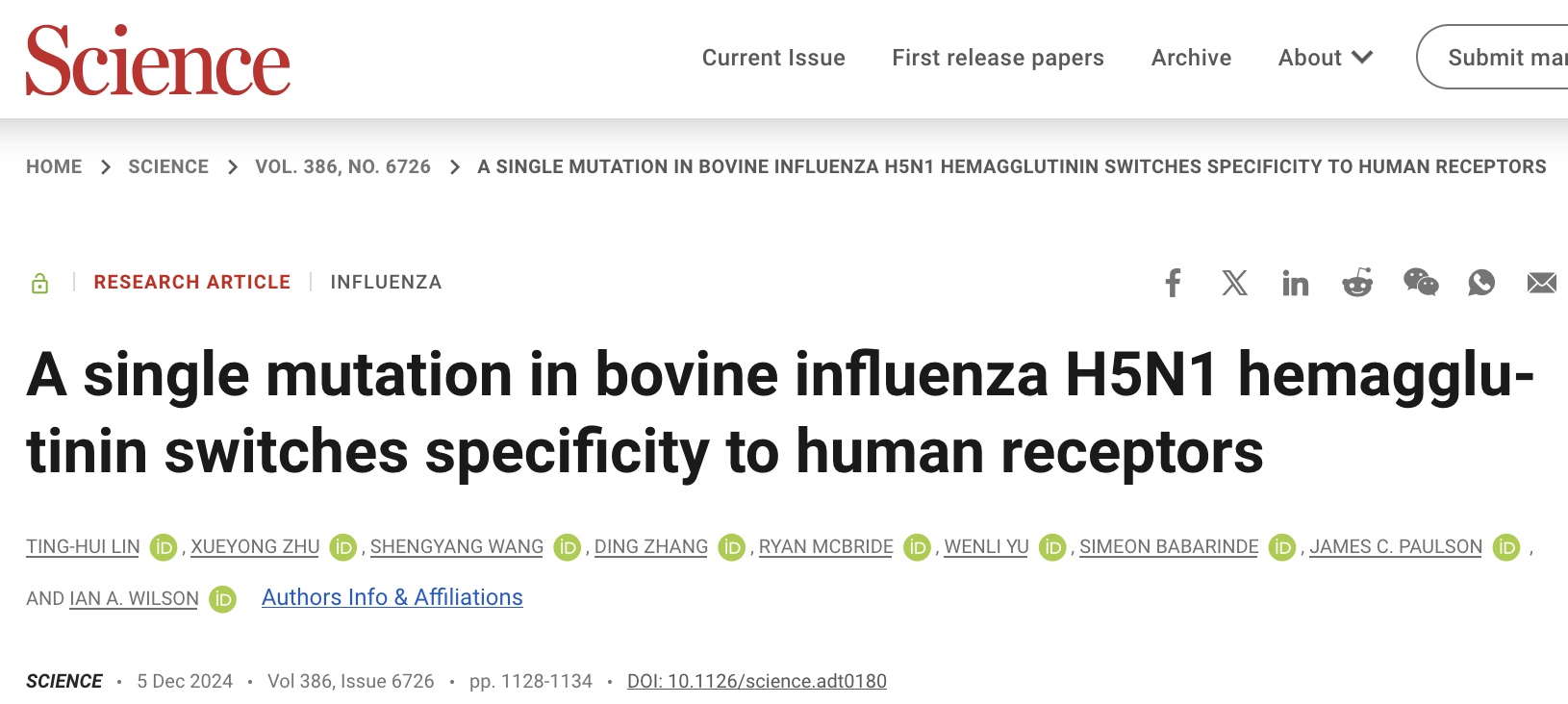 NIAID and Scripps Institute publish a single nucleotide polymorphism that makes bird-cow flu more susceptible to humans–inviting the creation of new GOF bird flu’s by labs worldwide