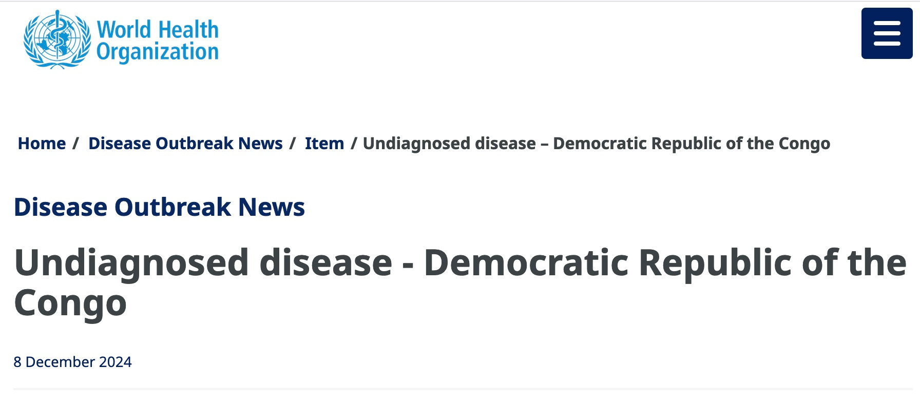 Citable reference: World Health Organization (8 December 2024). Disease Outbreak News; Undiagnosed disease – Democratic Republic of the Congo. Available at: https://www.who.int/emergencies/disease-outbreak-news/item/2024-DON546