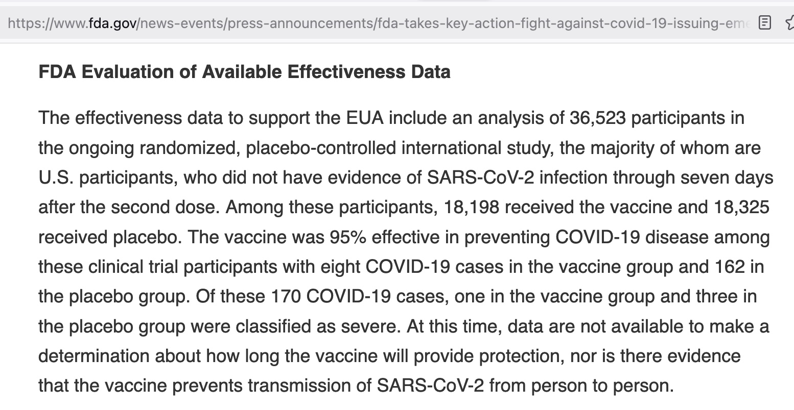 FDA also failed to require that Pfizer provide evidence the vaccine prevented transmission during initial clinical trials. Why? Below is from FDA’s Press Rlease when the EUA was issued on December 11, 2020.