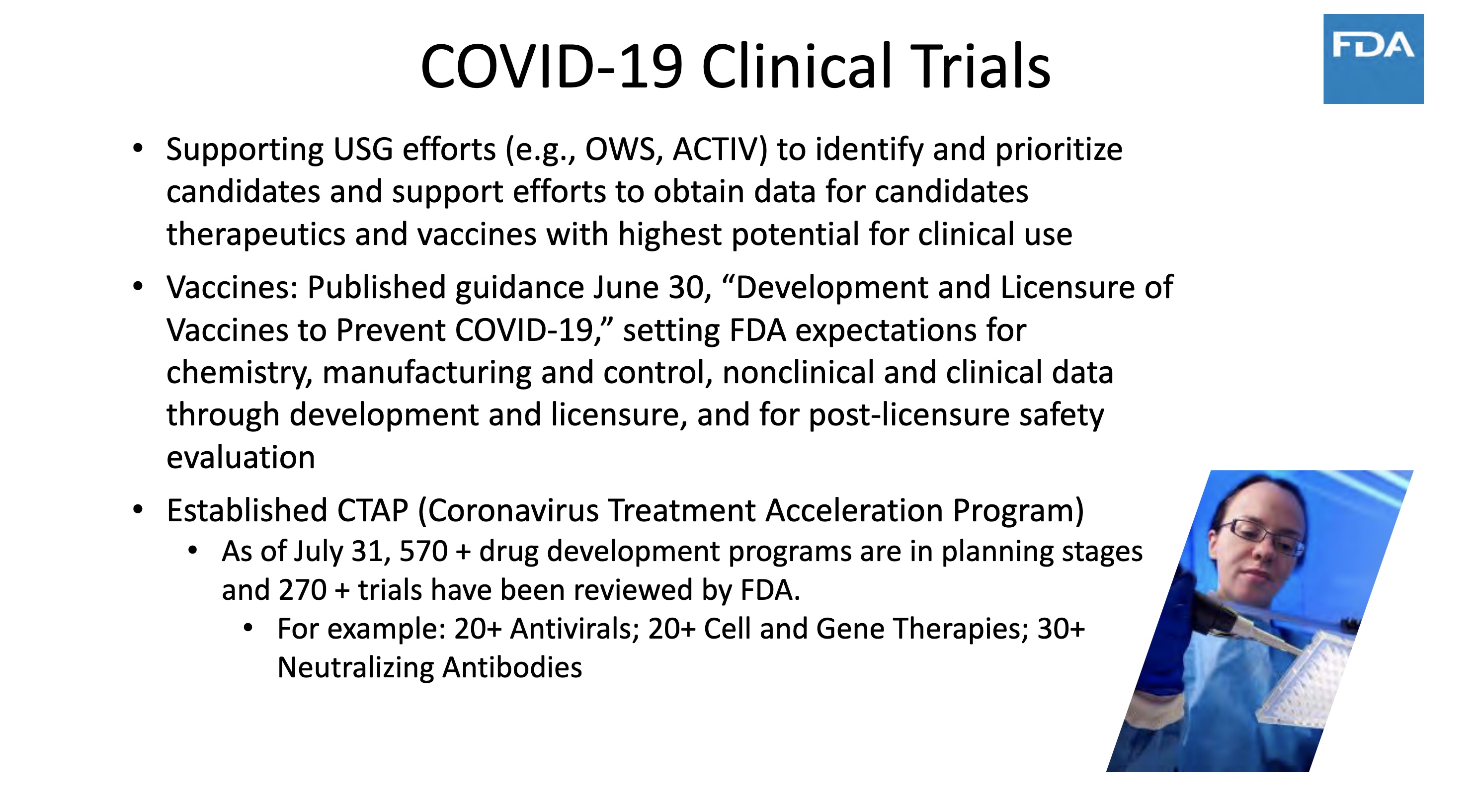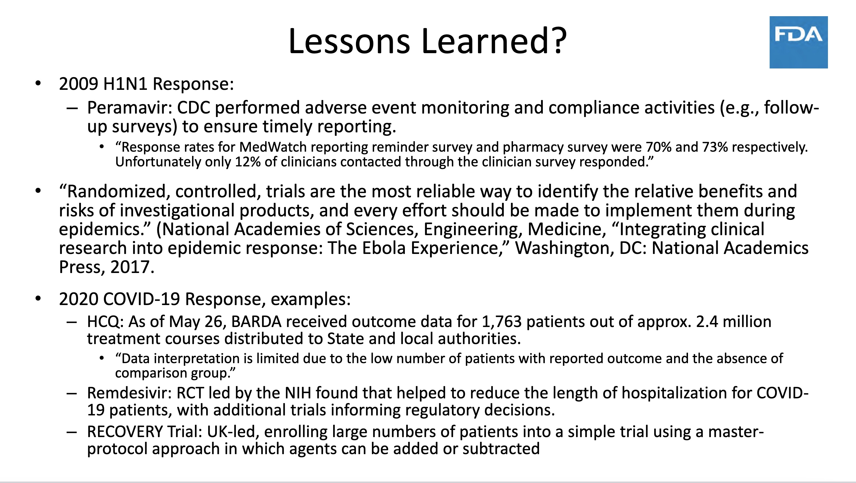 We often wonder how FDA assesses quality control of drugs and vaccines. Well, there is no quality control on this slide presentation. Ms. Sadove misspelled two of the drugs she discusses. She made the mistake of referring to hydroxychloroquine (HCQ) as hydrochloroquine. Since her office had a lot to do with issuing an EUA for HCQ in March 2020 and then revoking it in June 2020 with enormous fanfare, you would think she would know the drug’s proper name.
