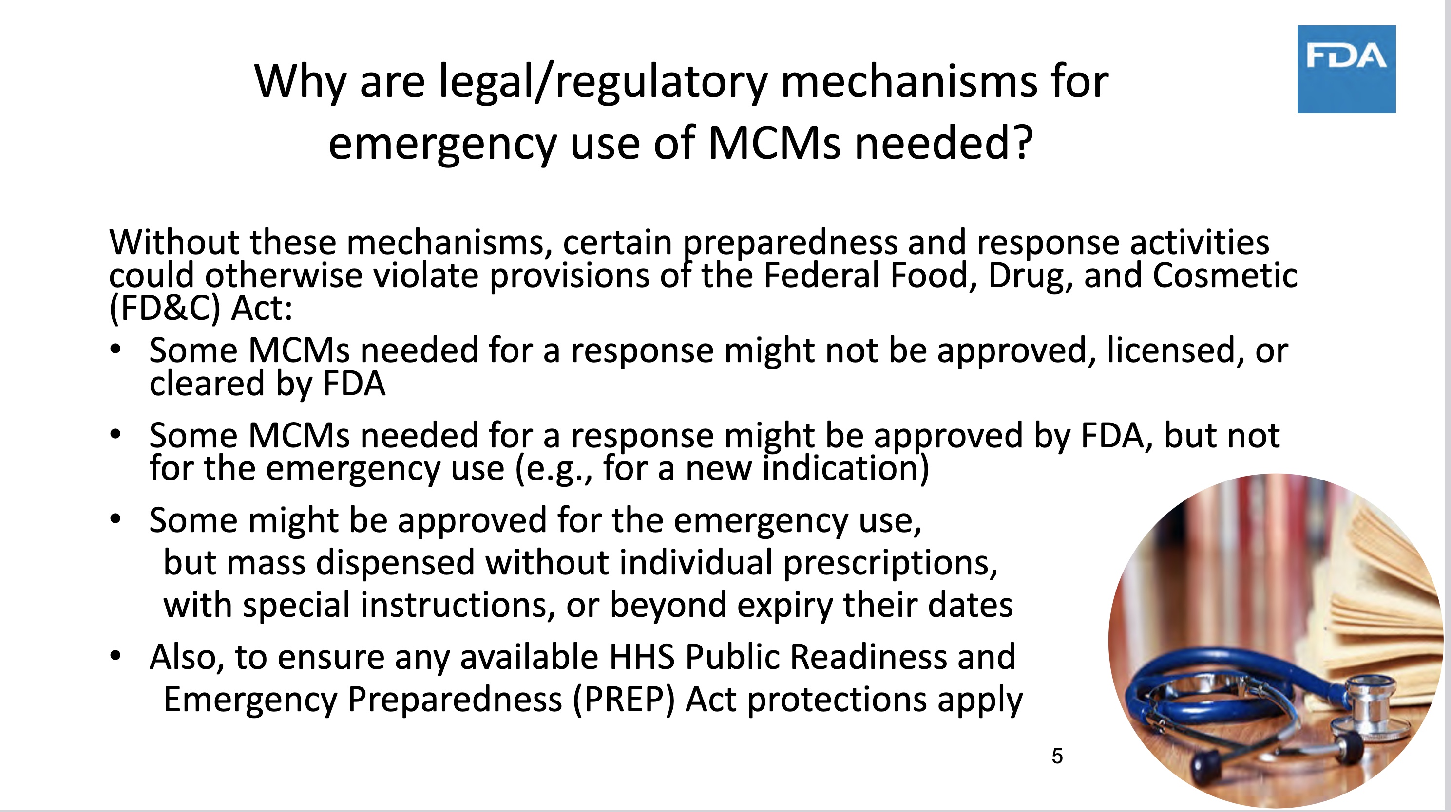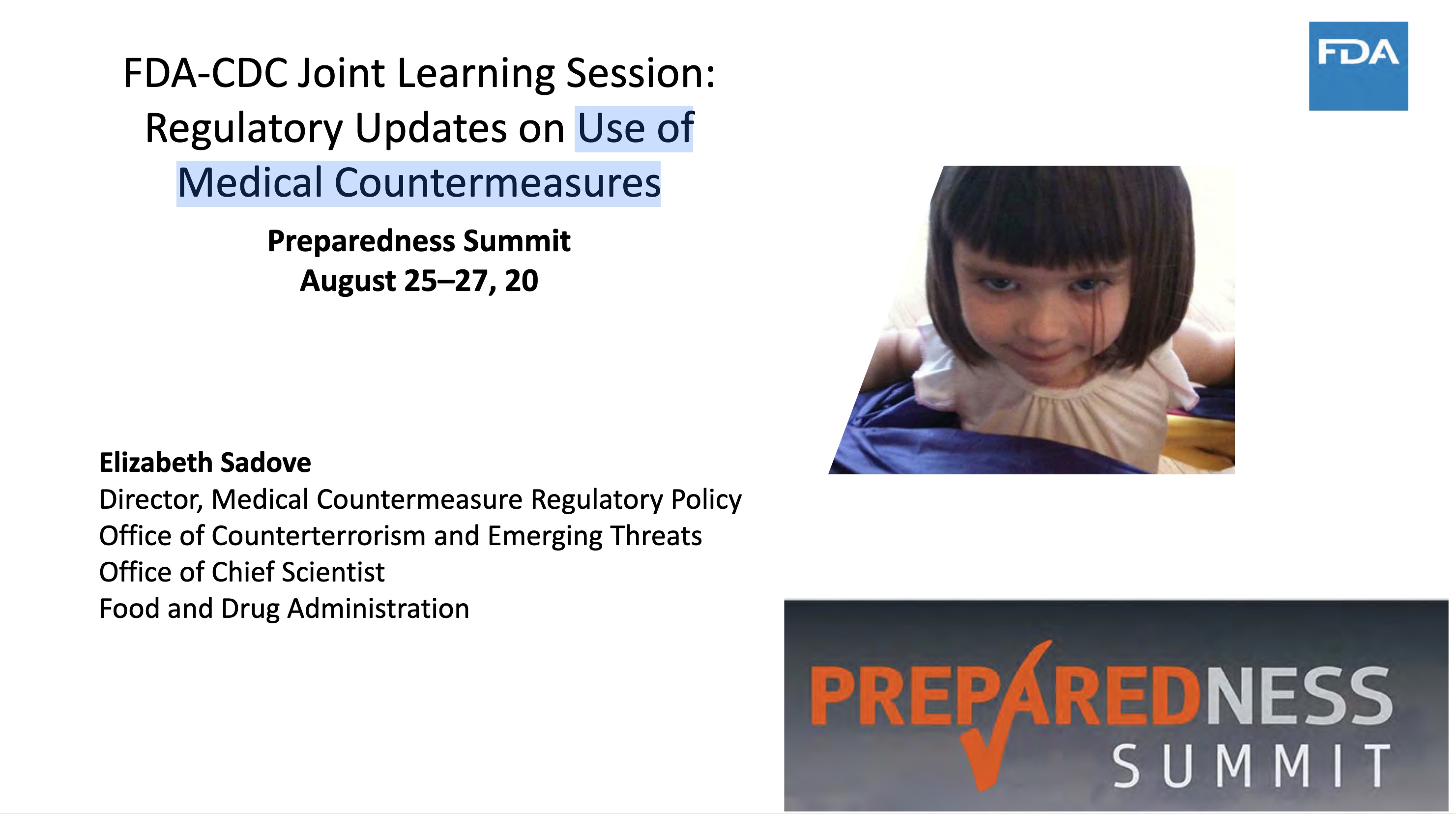 This presentation on medical countermeasures (and many others) was given by Elizabeth Sadove, JD, one of the FDA attorneys.