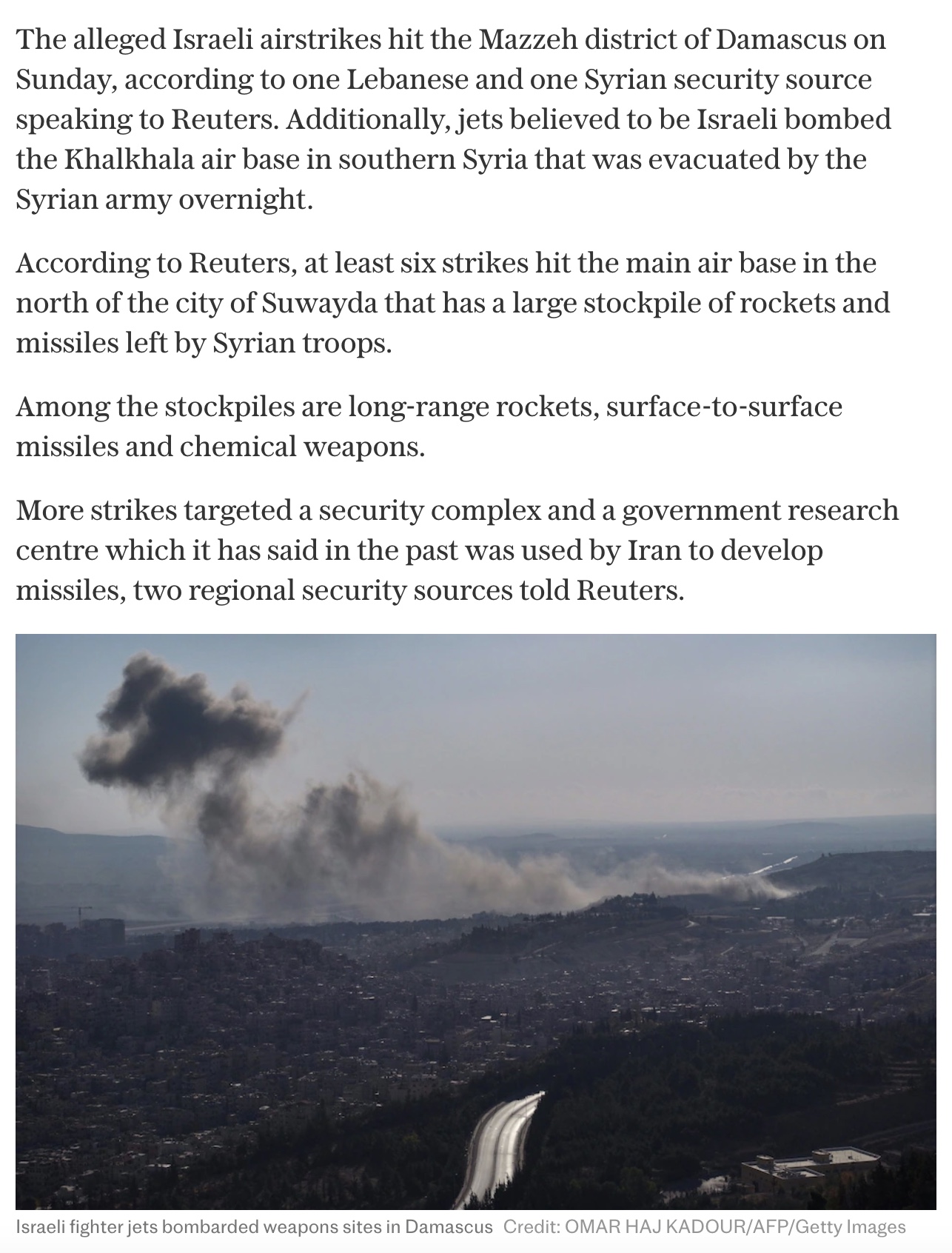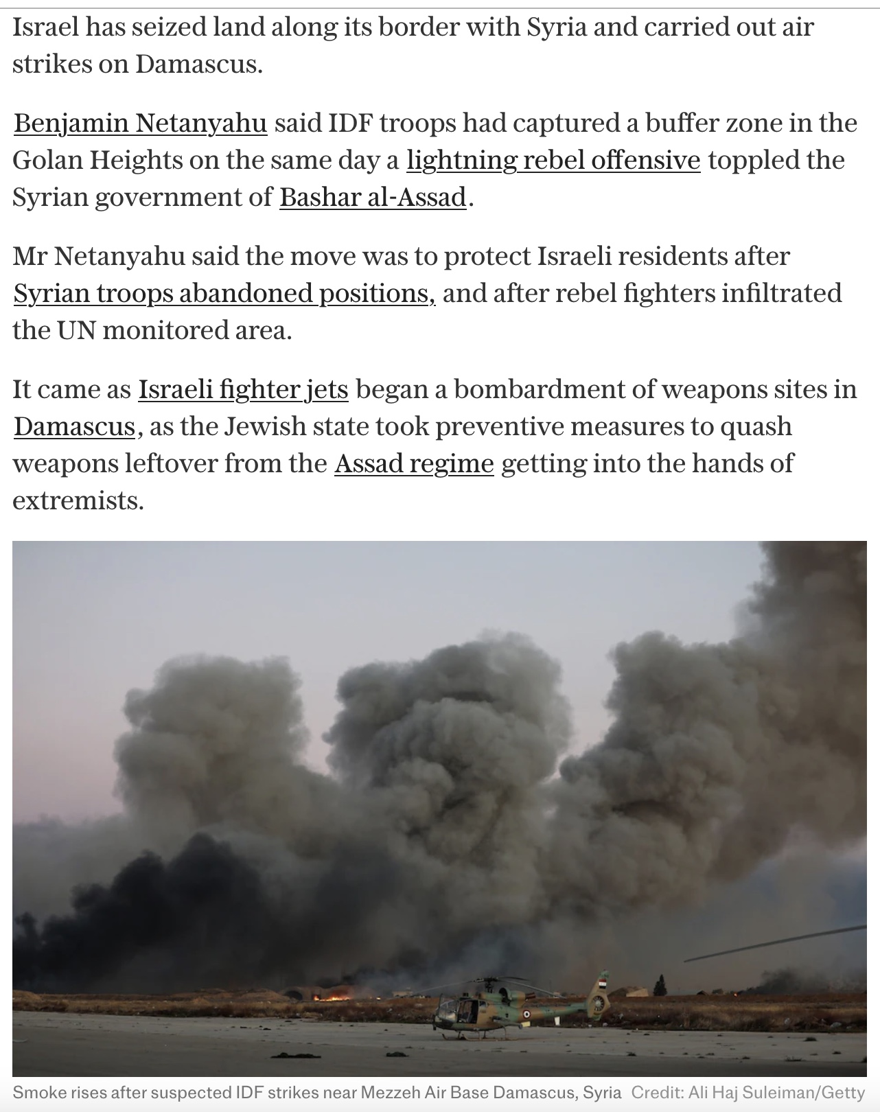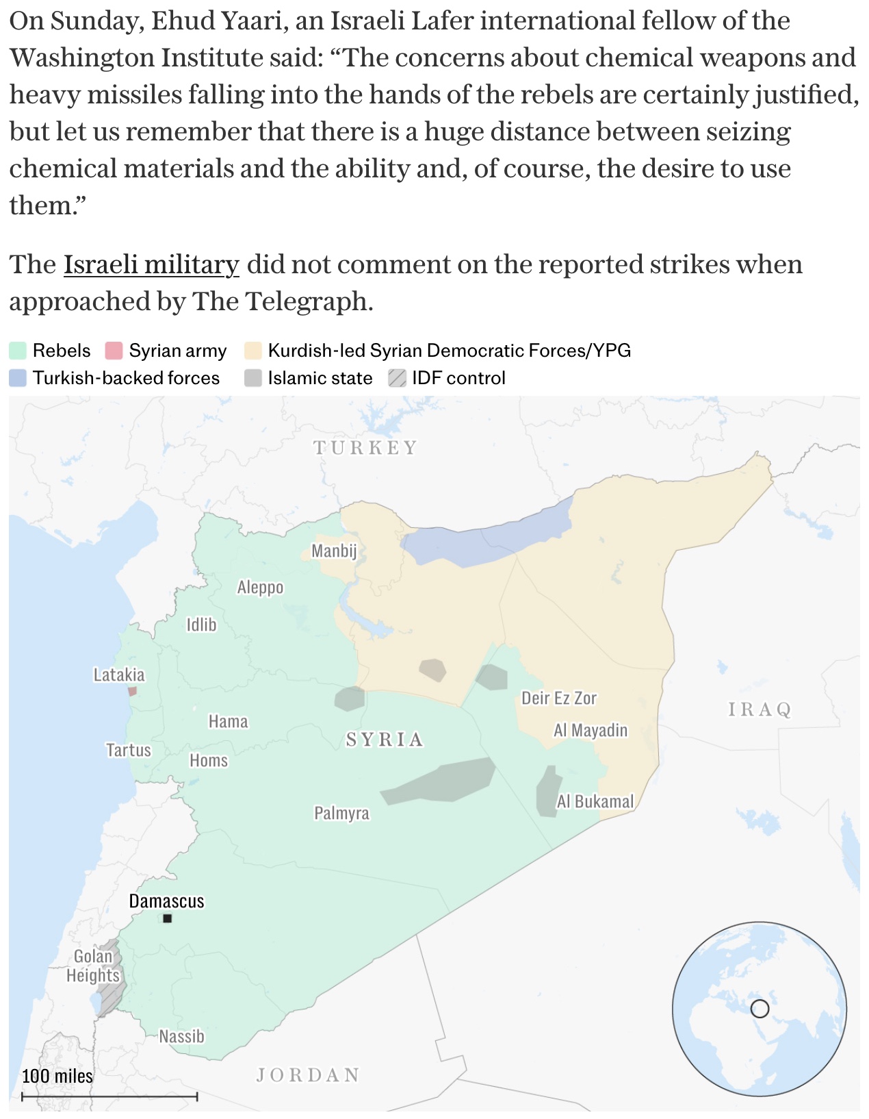 Syria’s government falls, and it looks like it will be balkanized. Israel grabs a little land and bombs sites in Damascus