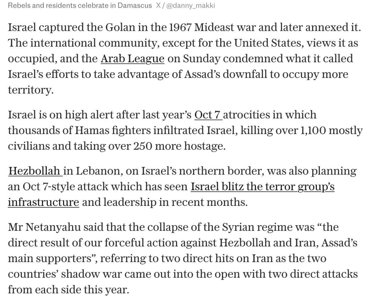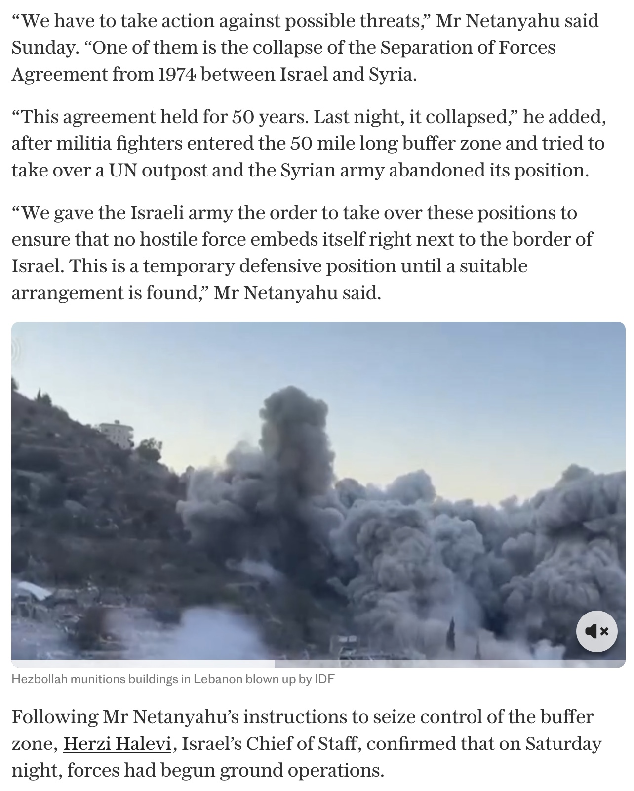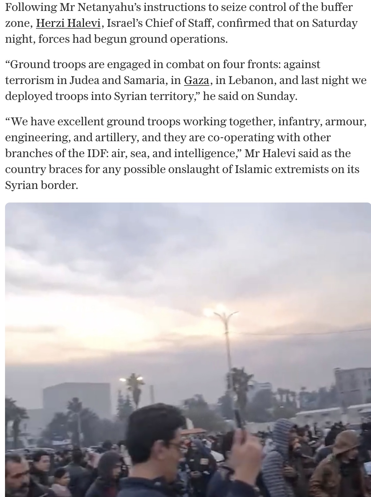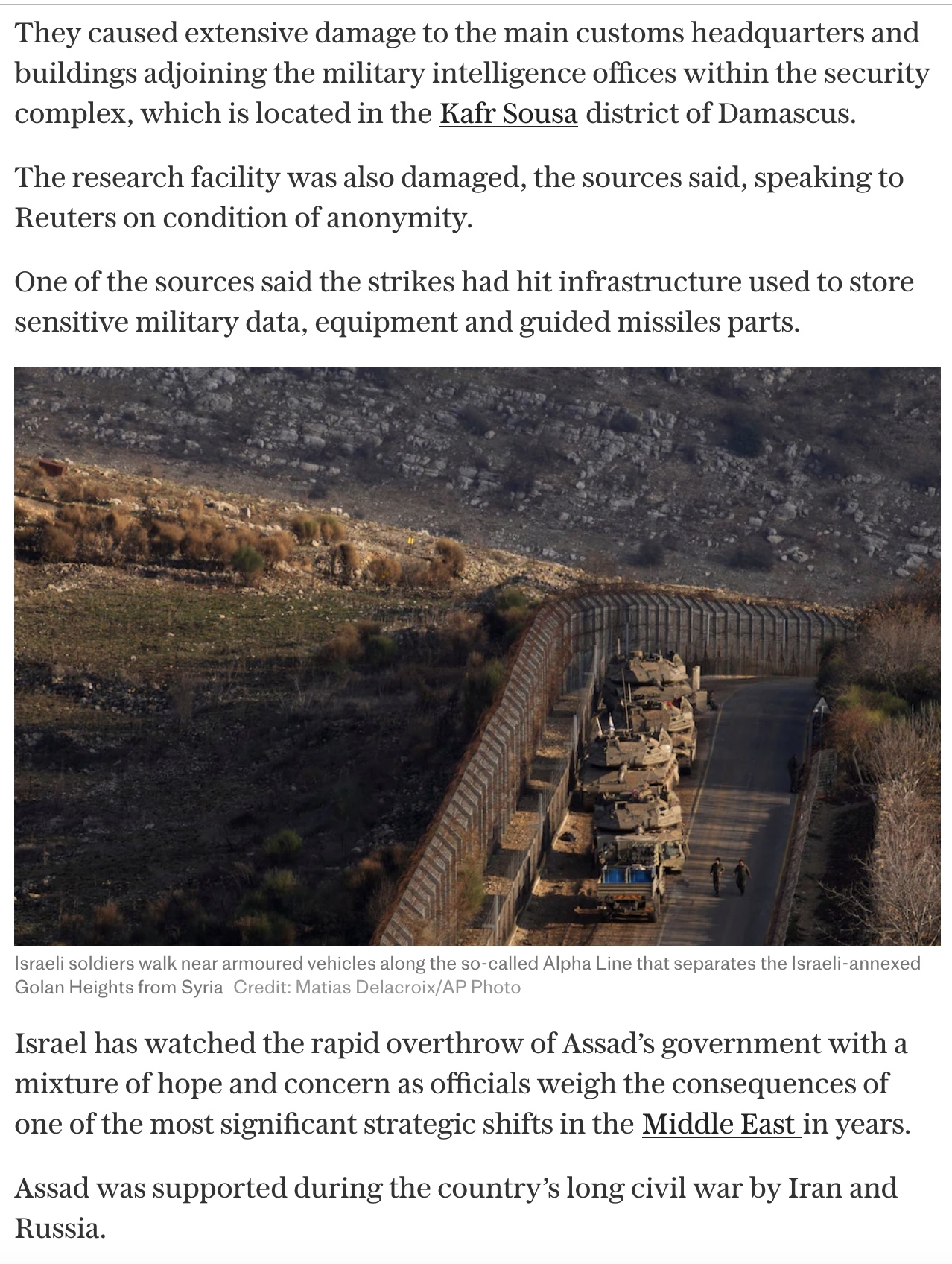 Syria’s government falls, and it looks like it will be balkanized. Israel grabs a little land and bombs sites in Damascus