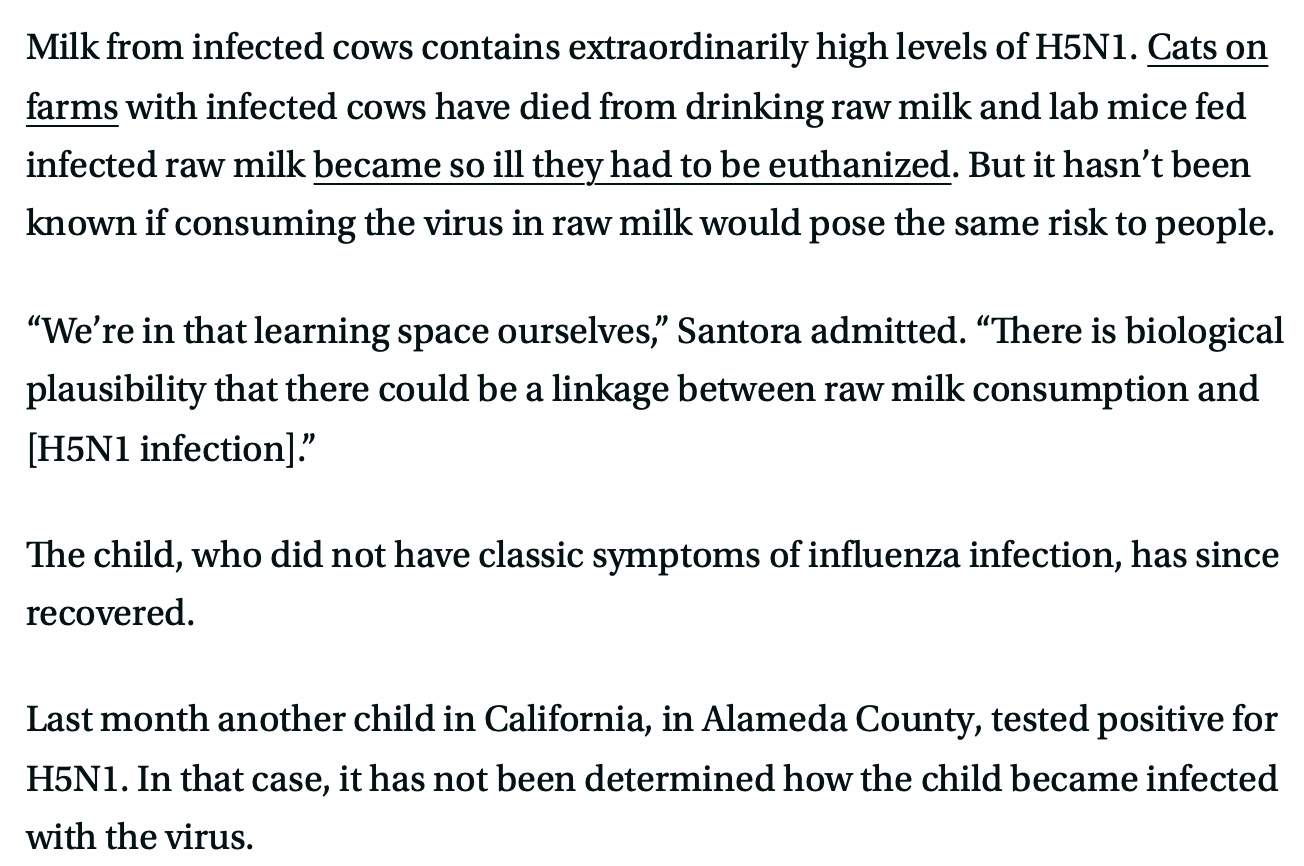 Addendum: From today’s STAT (the entire article is behind a paywall I refuse to pay for, but reader provided it) is an acknowledgement that FDA and California’s gazillion dollar attempt to pin a bird flu infection on raw milk has fizzled, since the toddler could have had any kind of flu. Unless the CDC pulls a rabbit out of a hat, and 5 weeks before the inauguration I doubt anyone there would be willing to do so…