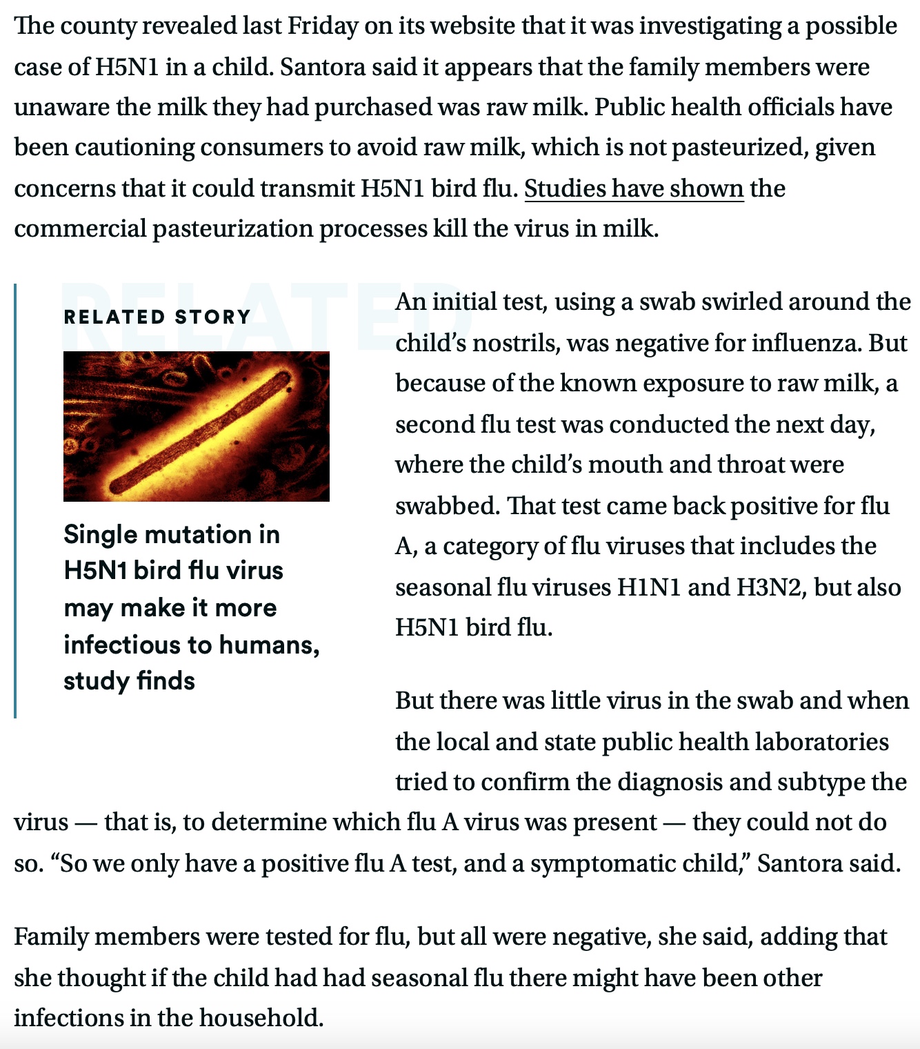 Addendum December 13, 2024: Damn, we could not find evidence of bird flu or any flu no matter how hard we tried. The state lab could not find it. CDC could not find it. The national publicity rested on a county lab’s thinking it found influenza A—which happens all the time. That is how desperate the feds are to blame H5N1 in humans on raw milk. And BTW there is no evidence the baby’s acute illness had anything to do with raw milk, either. From today’s STAT: