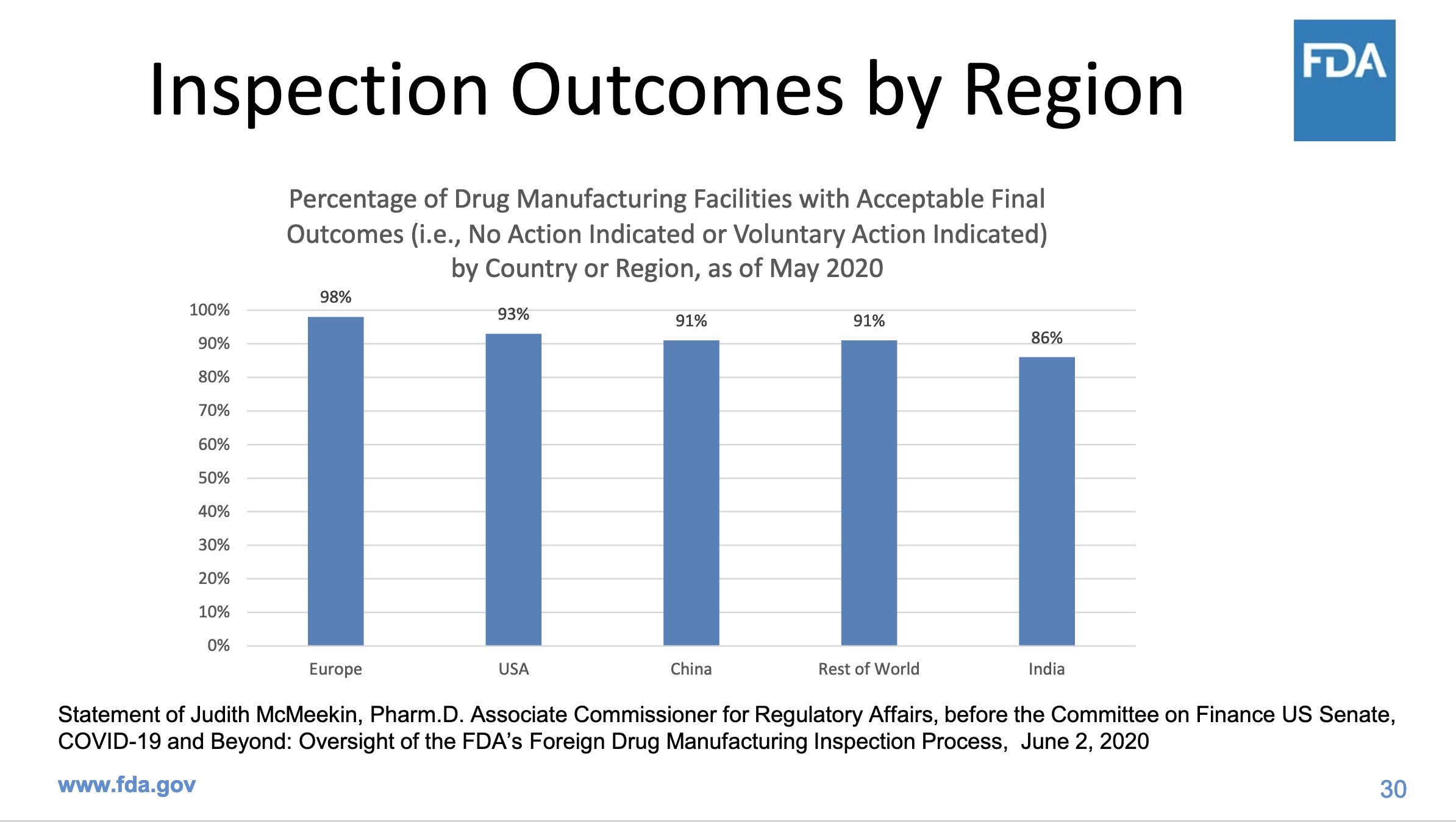 Note that the percentages of companies that passed FDA inspections refers to final outcomes: after the company has had a chance to fix the problems identified in an FDA inspection. FDA does not tell us how many failed the initial inspection. It is worrying that 1 in 7 manufacturers in India still can’t get things right even after their flaws were identified, and that the same is true for China, with 1 in 11 failing final inspections. In the US, 1 in 14 fail final inspections. How many of us have been consuming drugs produced by these companies?