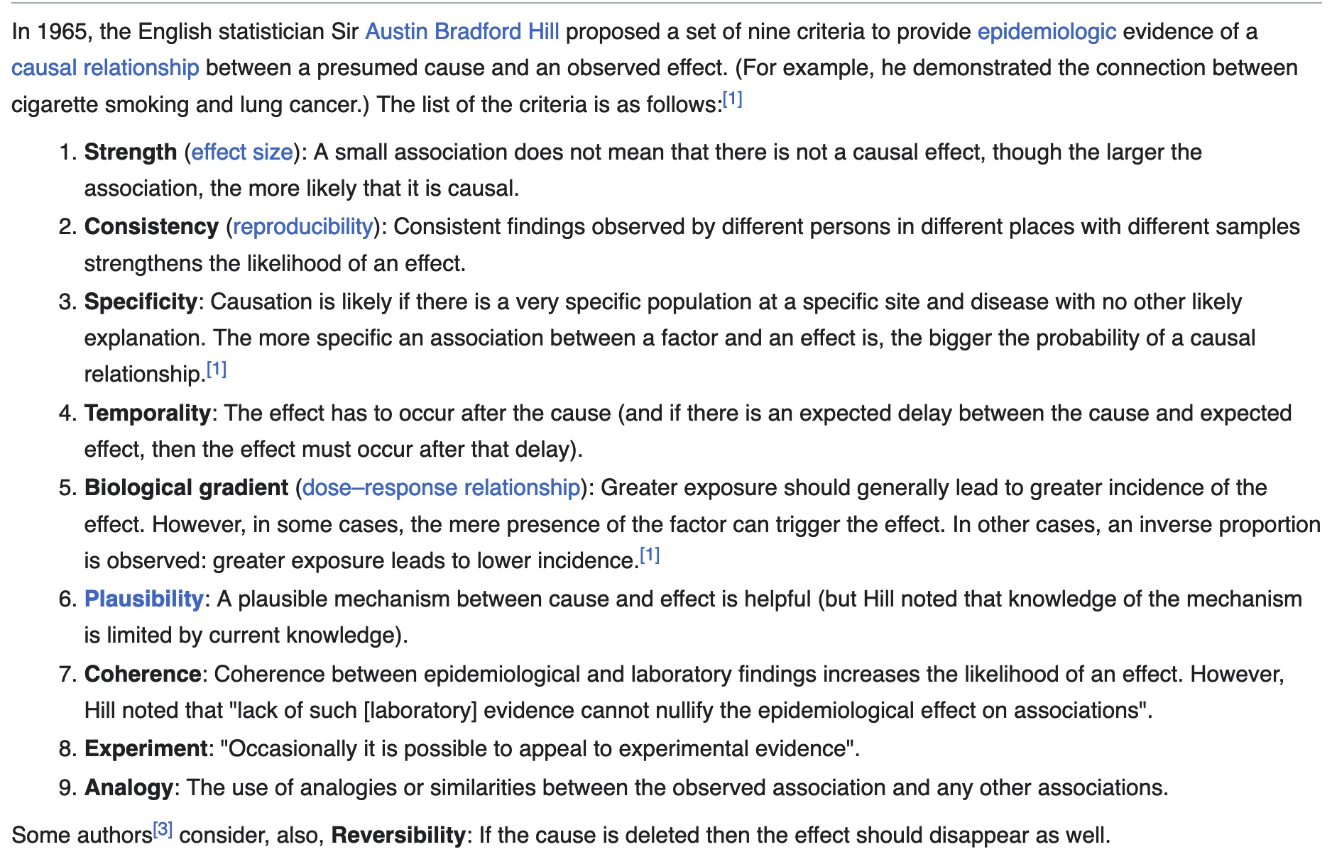 Then another insupportable claim is made: “progress in vaccine safety science has understandably been slow,” because the epidemiological data do not support causal conclusions and the biological mechanism is not understood. That is total nonsense. Epidemiologic data can support causality determinations, especially when other information, such as the temporal relationship between vaccination and adverse event is fairly uniform. See Austin Bradford Hill’s list of factors that support causality decisions below: