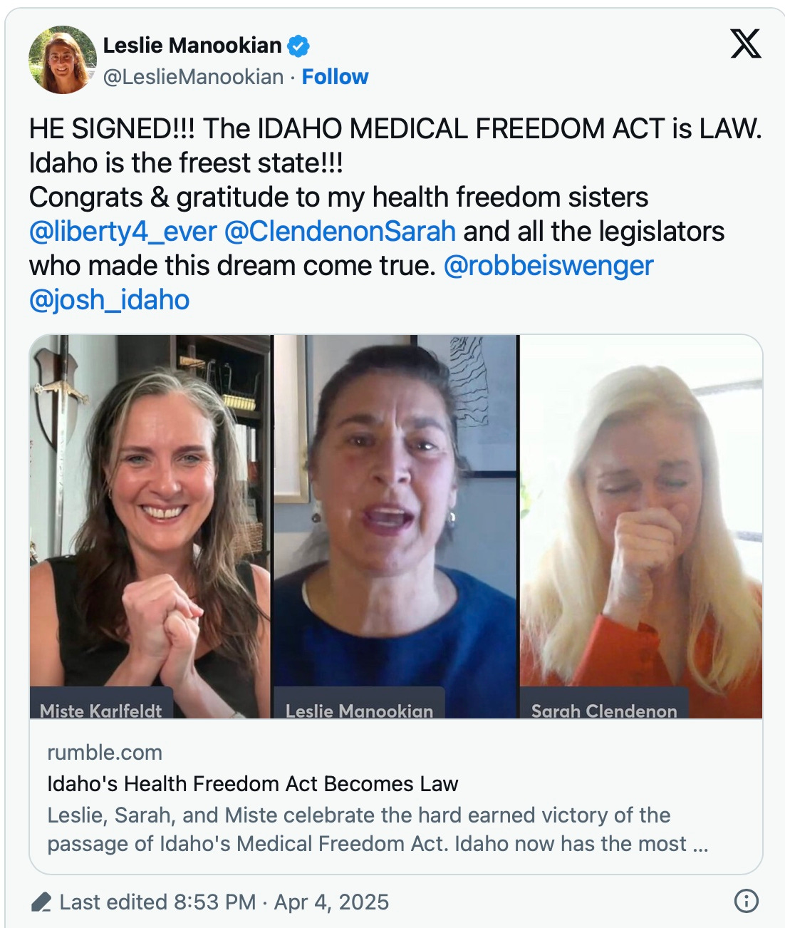 The bill’s author, Leslie Manookian, president and founder of the Health Freedom Defense Fund, celebrated the new law on X, where she posted a video of her and co-organizers Miste Karlfeldt and Sarah Clendenon discussing the victory for the medical freedom movement there.