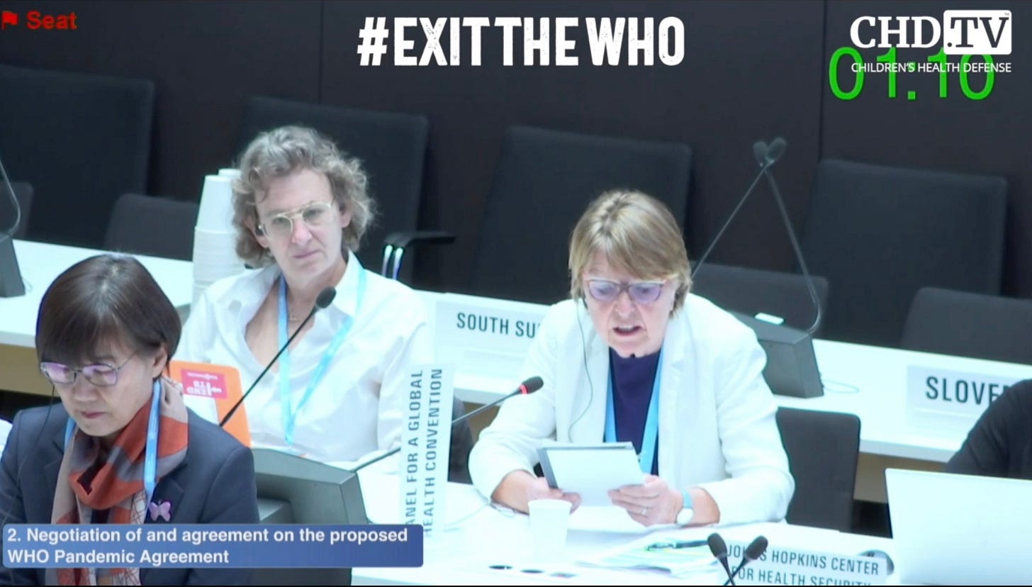 Walter Ian Lipkin coauthored the bogus Proximal Origins paper. He is a coverup agent, also covering up Ebola’s odd origin in west Africa, Lyme, and Chronic Fatigue Syndrome. He gave an honorary title to Nina Schwalbe, the Pandemic Treaty cheerleader who is in Geneva today, carefully pushing for the treaty to move forward as a designated “stakeholder.” Here is my screenshot. She is in the middle.