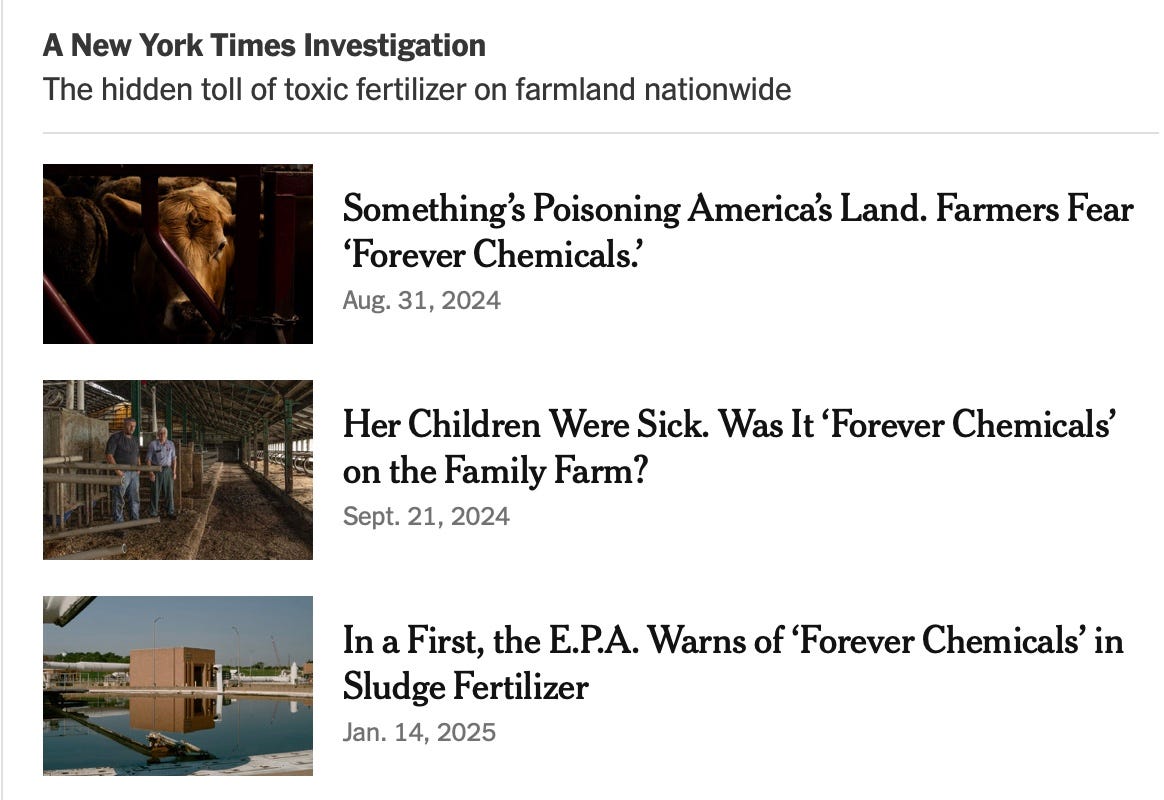 Sludge from city sewage has been used as fertilizer for decades, a practice the federal government has long promoted. Last year, a New York Times investigation examined the widespread risks of PFAS contamination that resulted. And early this year, for the first time, the E.P.A. warned of the health risks of PFAS in fertilizer made from sewage sludge.