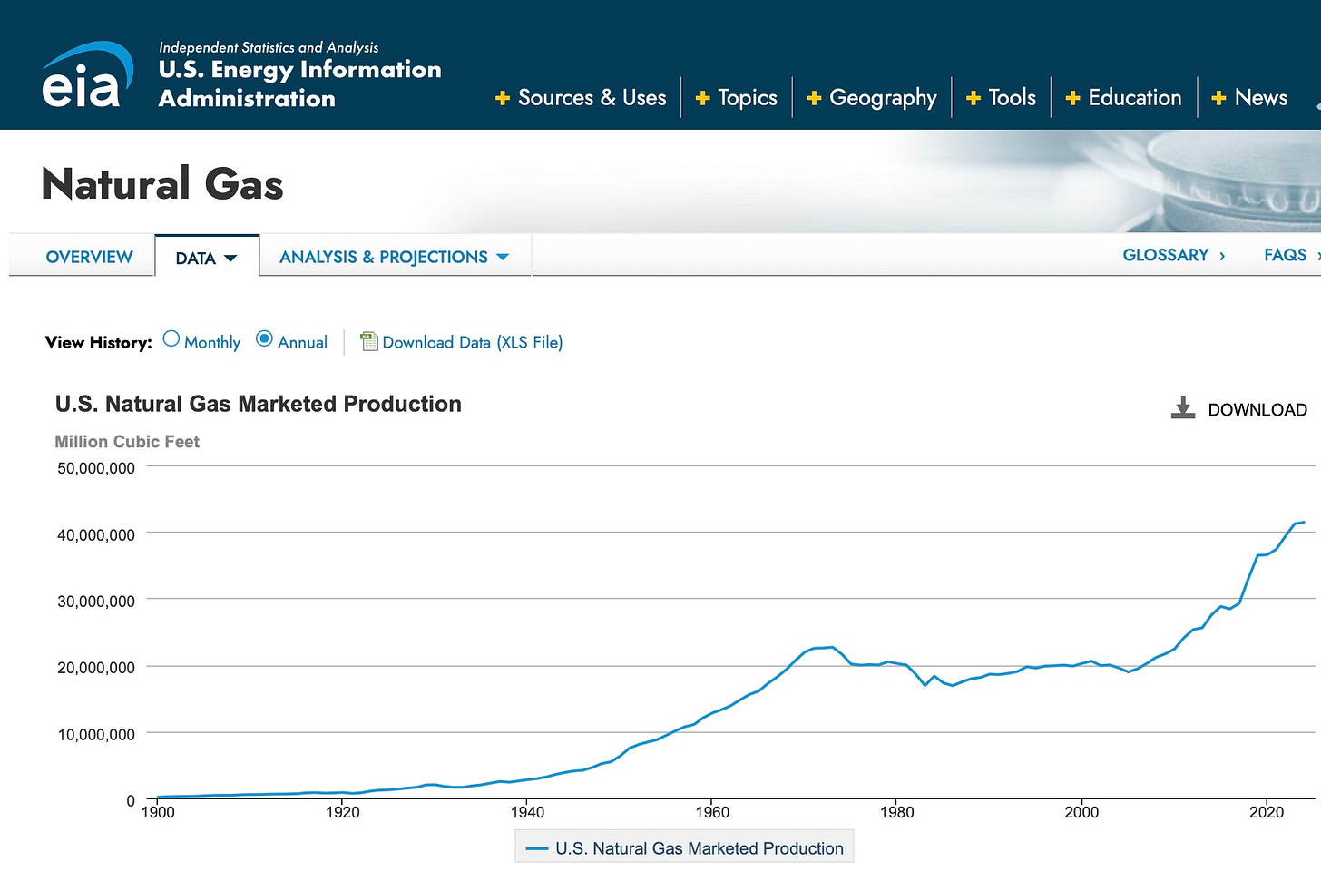 Food requires fertilizer. Producing the nitrogen in most commercial fertilizers requires natural gas to power the production of ammonia in the US. Despite all the talk about reducing fossil fuel production, and despite all those solar farms that have sprouted up everywhere, the US continues to increase extraction of natural gas.