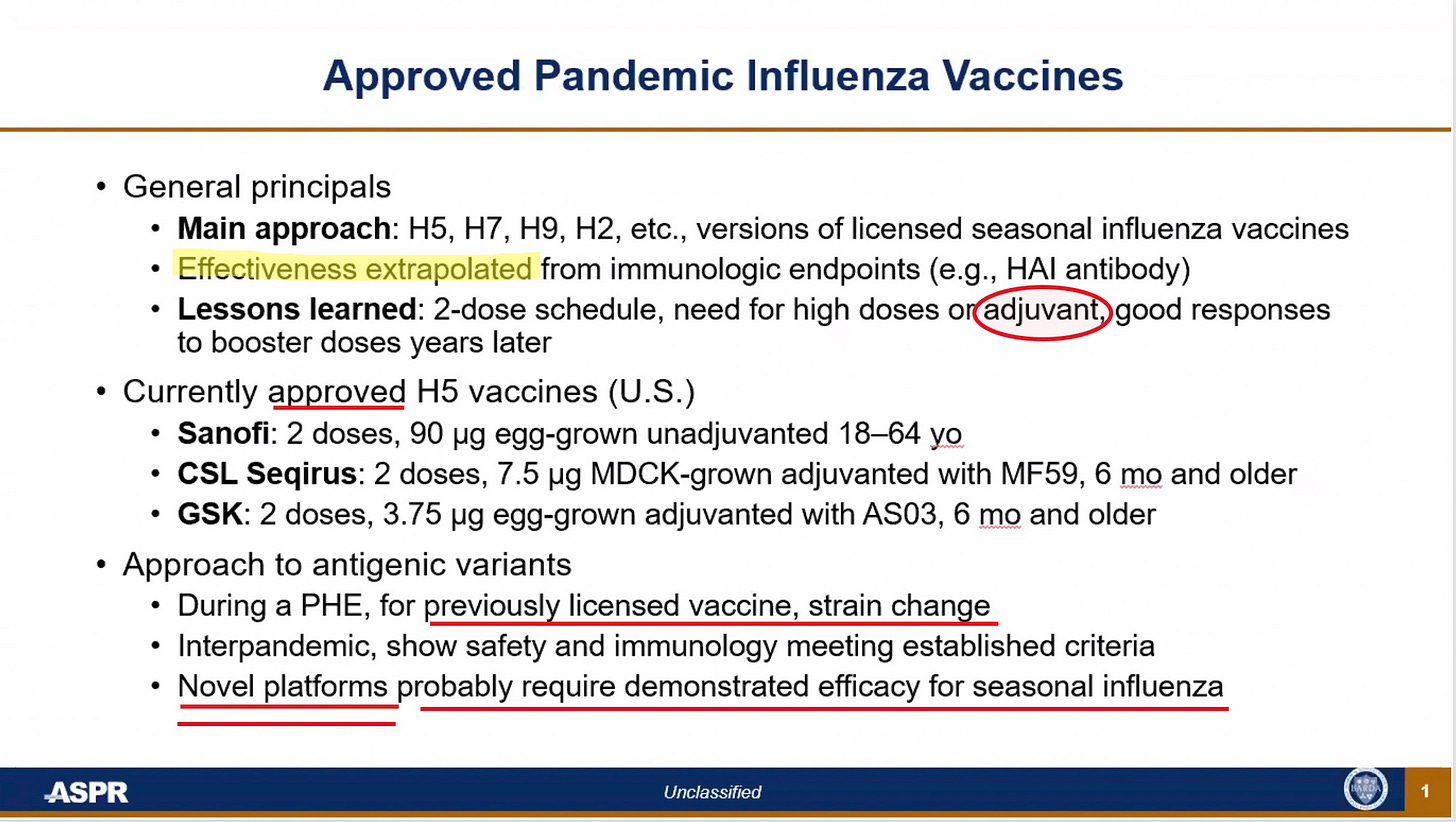 ASPR refers to the office of the HHS Assistant Secretary for Preparedness and Response. This speaker acknowledged they don’t have data on effectiveness, so they fudge it by pretending that antibody levels are an acceptable surrogate—without ever proving they are. This is technically a “no-no” for FDA but our fearless public health officials have been fine with this pretension for COVID vaccines, so why not continue it with bird flu vaccines?