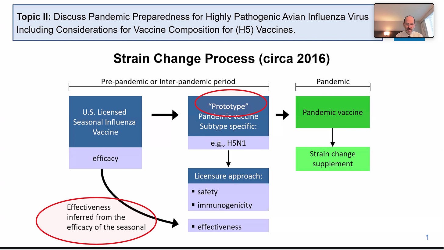 The slide above has a speaker who was very high up in FDA’s vaccine division. He makes it clear that as far as FDA is concerned, one plan is to grandfather bird flu vaccines in, based on imputing efficacy from seasonal vaccines. Sir, with a -27% efficacy last year, how is that going to work? Guess they have to infer efficacy from a different year… they are excellent at workarounds.