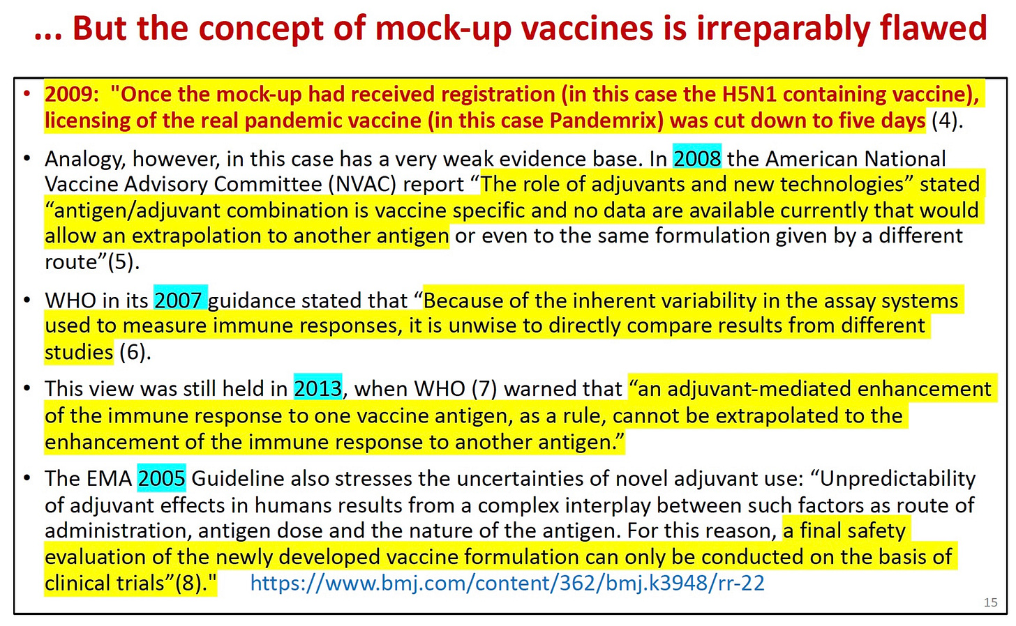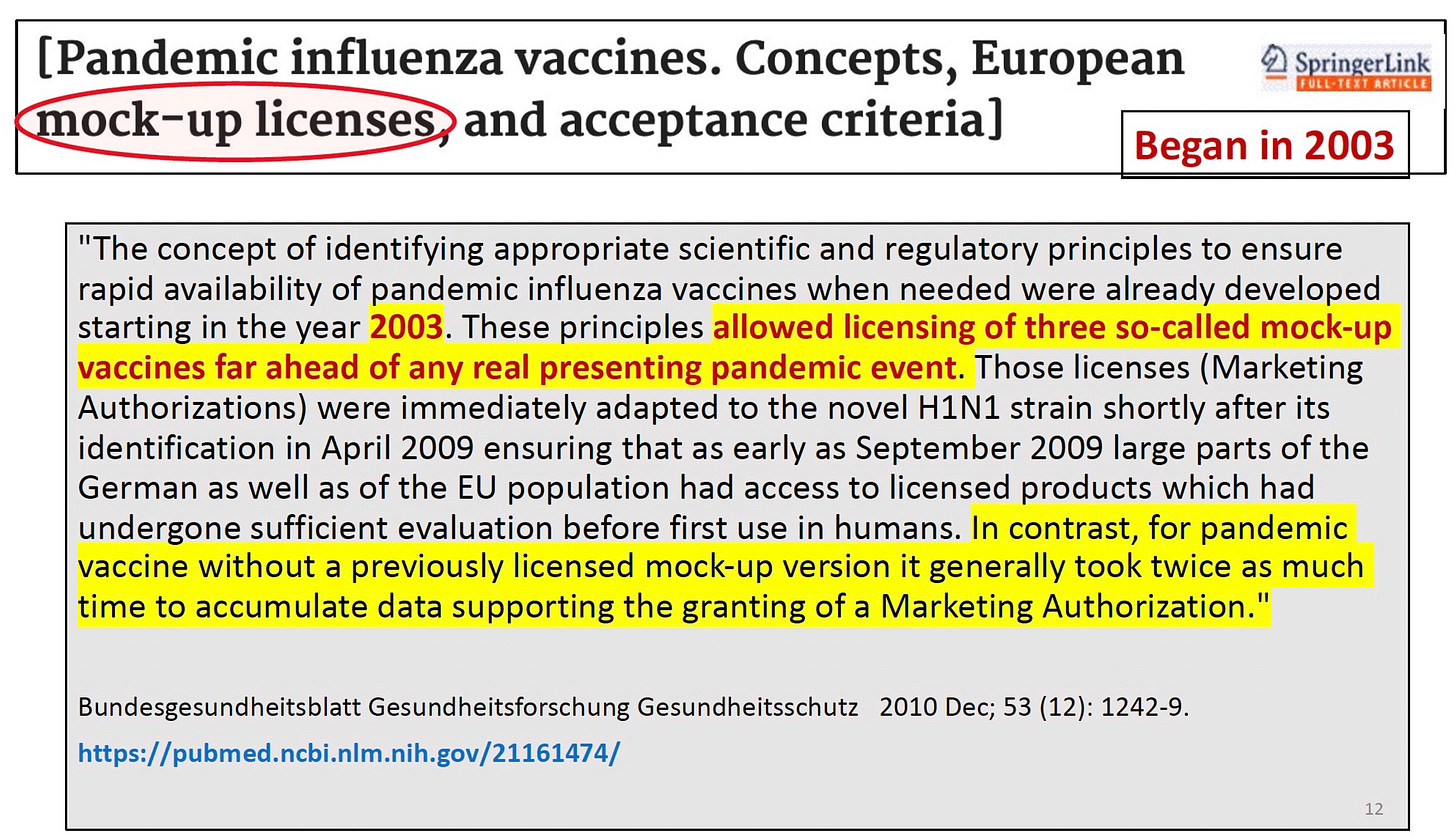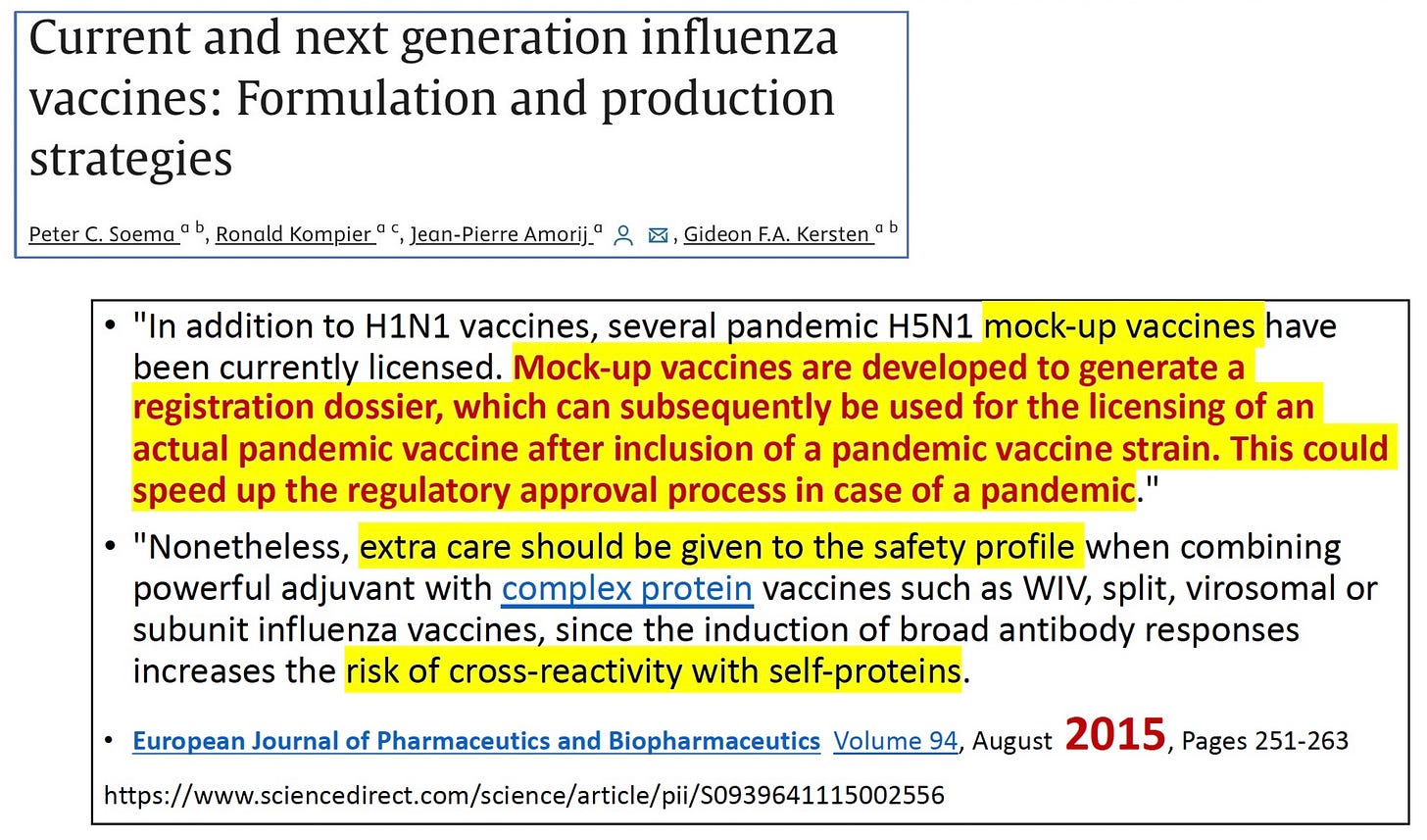 Above is an academic article published in 2010 that discusses the new concept of “mock-up” vaccines—licensing vaccines you never intend to use, so you have a paper trail whose license can be slapped onto any new antigen you want to put into the mockup framework. Yes it is a very real thing. Below is another article discussing the method from 2015.