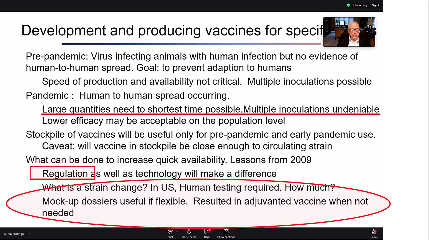 Arnold Monto gave the talk above. Nearly 90, he chaired most of the FDA advisory meetings for COVID vaccine approvals and authorizations, using an iron hand to control the discussions. Here he notes that you can’t stockpile vaccines for a pandemic cause you don’t know what is causing the pandemic till it happens. If you want a licensed vaccine, you can use “mock-up” dossiers, which were used in 2009 for the swine flu pandemic that was mild.