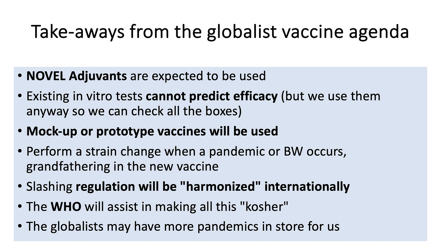 The above speaker is from CEPI. He is interested in rolling out untested vaccines to the whole world, most of which never uses flu shots or cares about flu—and which does not have a fake legal-regulatory system like the US. What to do in that case? He uses coded language to say that they hope to use the WHO and its Pandemic Treaty to force countries to legalize EUAs everywhere (“in all jurisdictions”). They definitely want mRNA vaccines to be included in whatever legal structures are adapted.