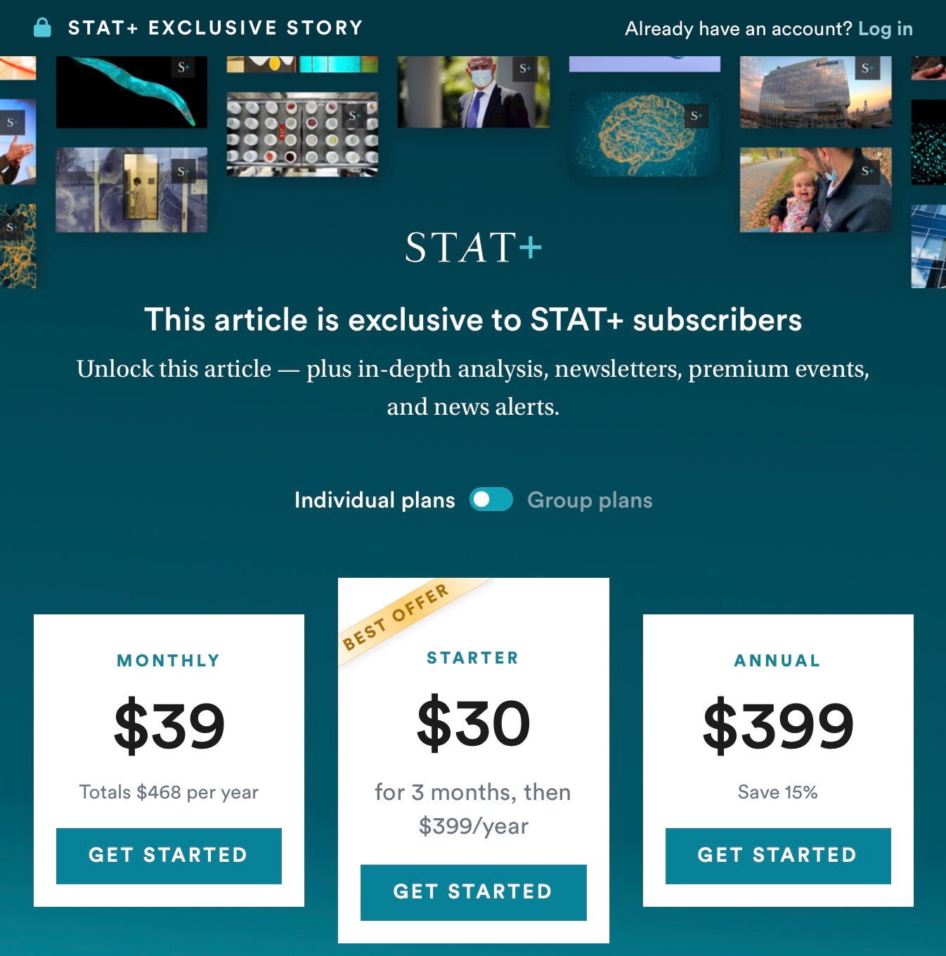 Who reads STAT? People who don’t have to pay for it themselves. Industry folks. The subscription costs are steep, it does include some advertising aka advocacy articles, and there are only a few articles published daily. In other words, it is an industry rag, though it is not designed to look like one. Virtually everything (except sponsored articles?) is behind a paywall. I had to say that so you can read STAT with the correct mindset.