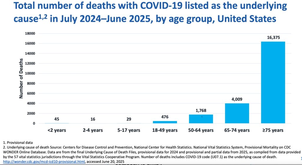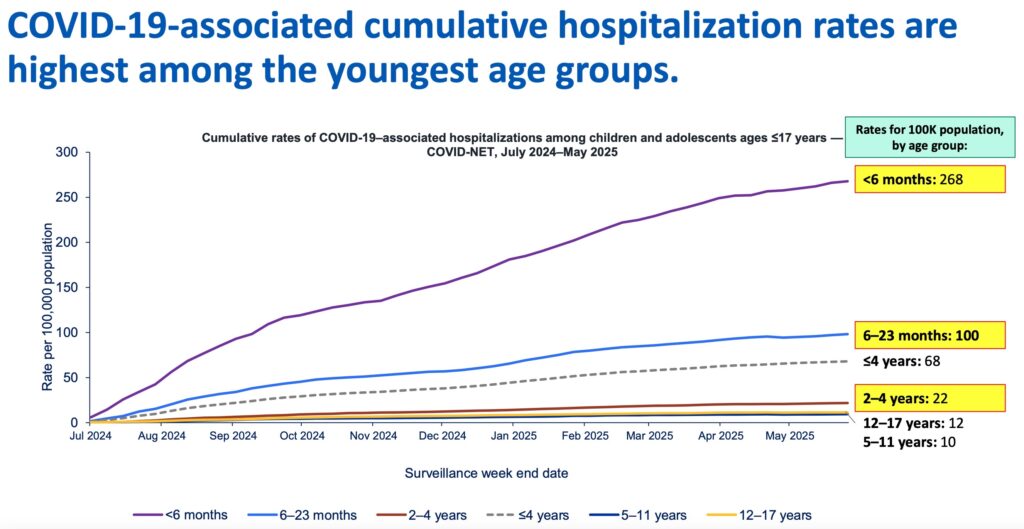 Worse, the decision means that vaccines will be denied to children with risks yet to be identified — that is, dangerously untreated diseases. Moreover, it’s difficult to identify which infants — the highest-risk pediatric group — have the conditions that increase the risk of severe COVID during infancy, when the pediatric risk is highest. (The risk of severe COVID-19 is quite high in the first year of life; it then goes way down until later in adulthood.) In fact, infections like COVID-19 often unveil serious underlying pediatric medical conditions.