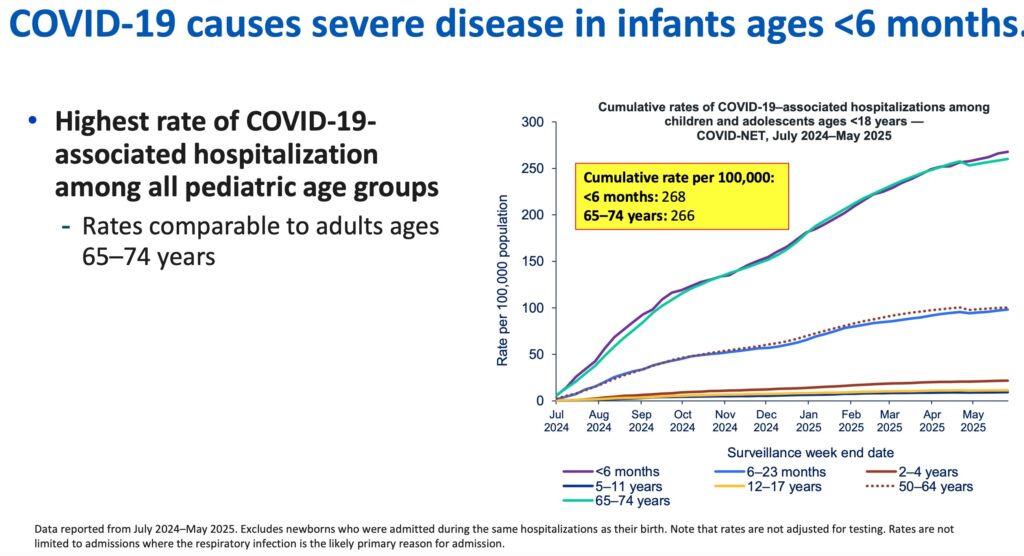 Look at the fine print under the second slide. While it is claimed that tiny babies are hospitalized at the same rate as adults aged 65-74, these numbers did not require that patients have a positive covid test, nor that they were hospitalized for COVID. Hmmm.