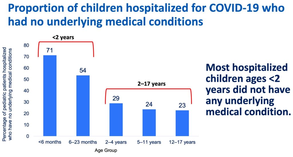 Rather than granting approval for all children starting at 6 months of age, the FDA limited its approval of Moderna’s pediatric COVID-19 vaccine to children known to have at least one high-risk underlying medical condition. That excludes the 54% of children ages 6-23 months who were hospitalized for COVID-19 in the last year despite having no known underlying medical conditions.