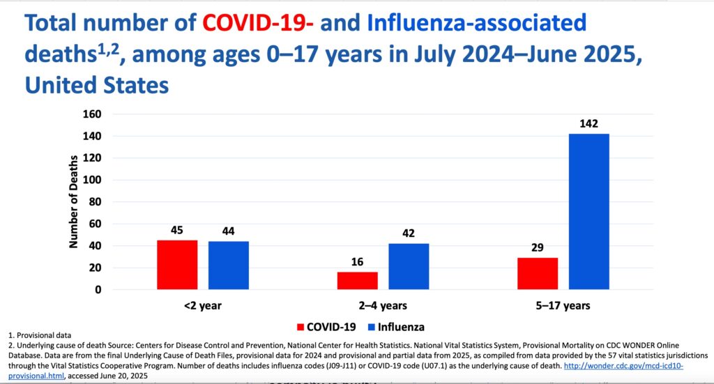 According to death certificates, only 90 US children died last year with COVID listed as the underlying cause of death. This is about half as many pediatric deaths as are said to be caused by flu (influenza A or B) each year.
